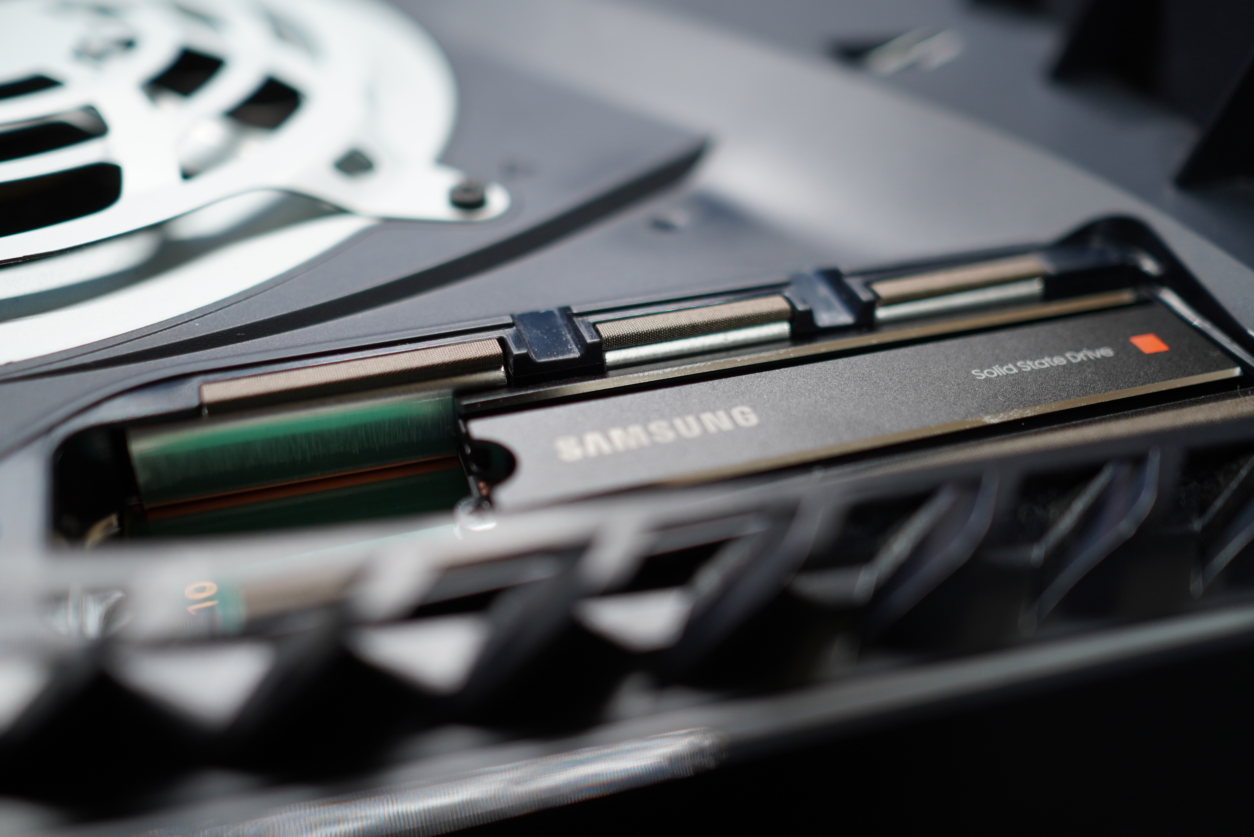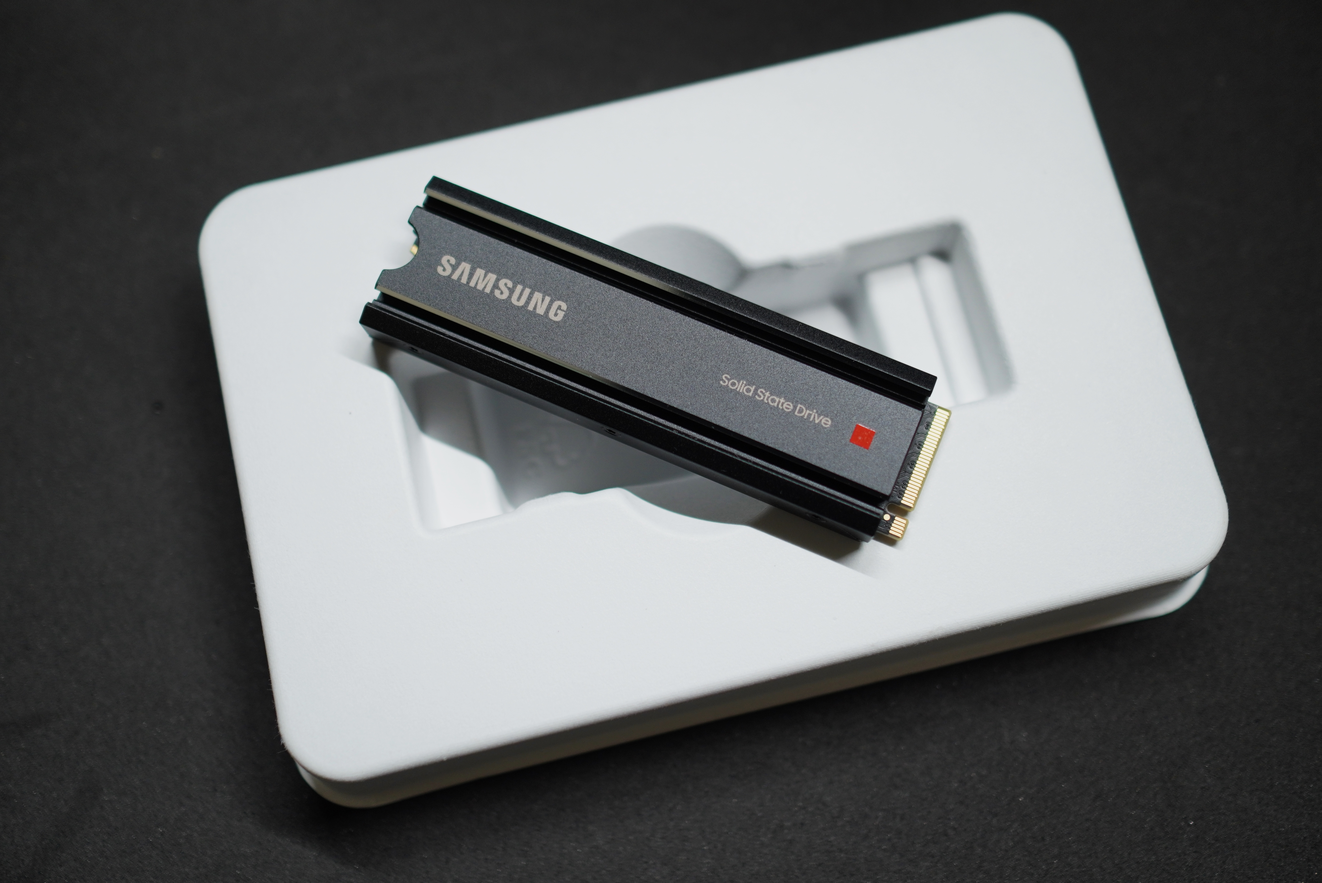 打開盒裝可看見內容物散熱片版本的Samsung 980 PRO多了符合PS5擴充槽空間大小的散熱鰭片,並且在控制器晶片上採用鍍鎳塗層,讓導熱與散熱都能更有效率,保持穩定的高效讀寫運算。