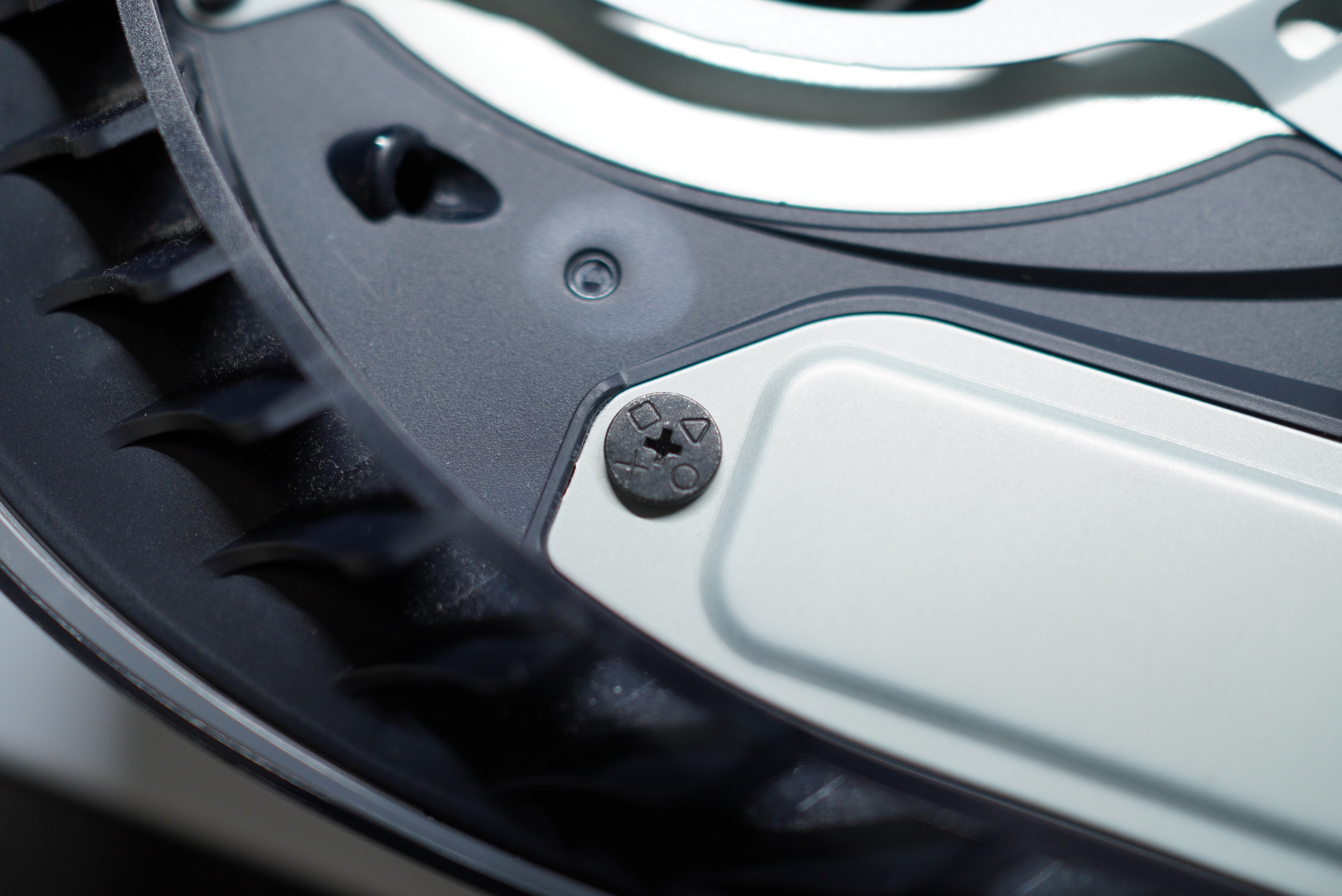 拆下背蓋後就會看見在PS5主機風扇旁邊有一顆騷包螺絲,第一眼看到就會發現PS5的設計師真的是把這OX△口符號當作經典彩蛋放到產品設計元素上,請用十字起子輕輕將他轉開並且拿下鋁片蓋。