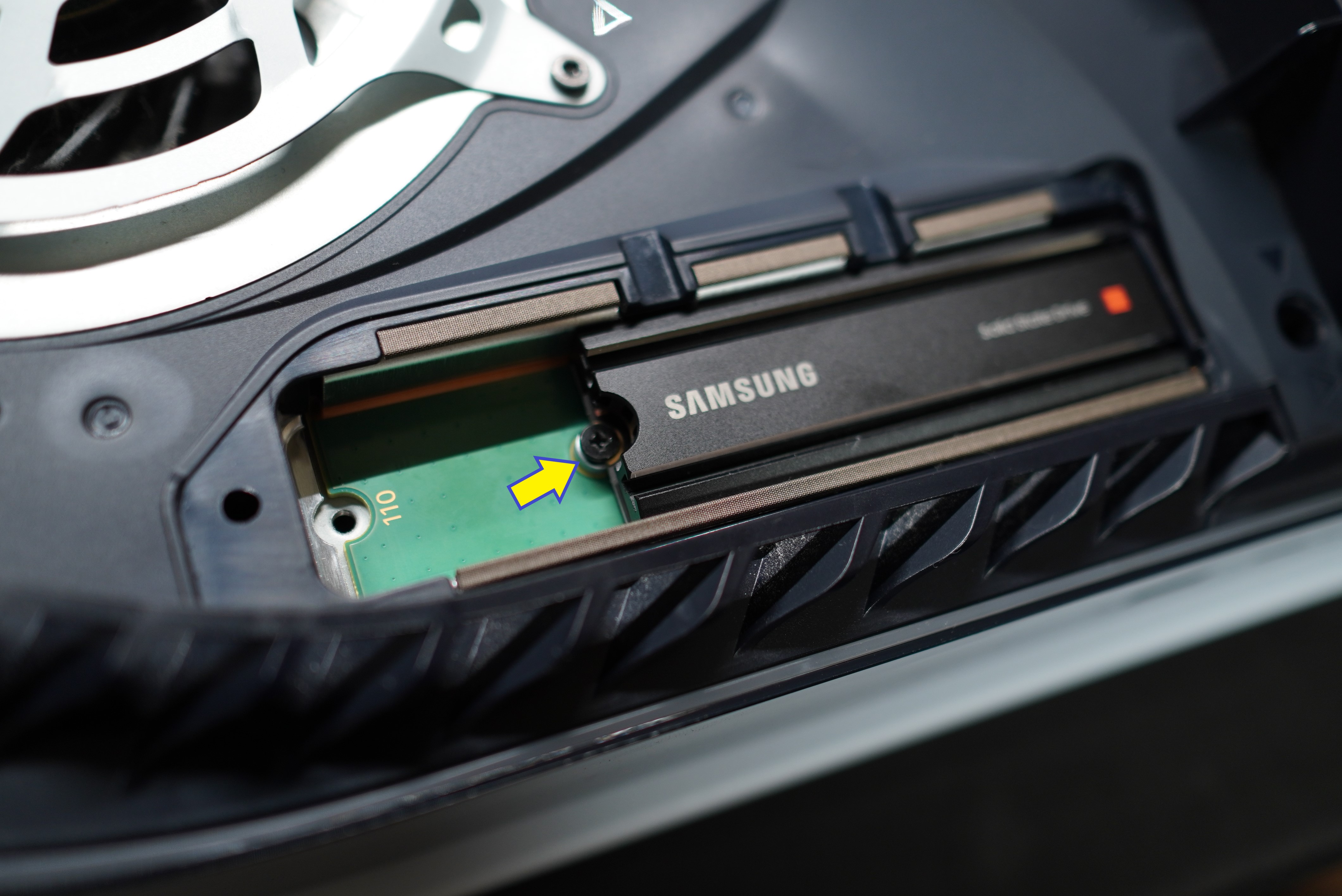 接著把Samsung 980 PRO散熱片版插入插槽,並且在上圖箭頭處把鋁製套筒墊入凹槽,再把剛剛那顆螺絲鎖回,接著將鋁片蓋跟騷包的螺絲鎖回就完成硬碟安裝步驟。