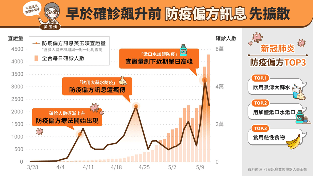 早在4月底疫情逐漸失控前,通訊軟體內的可疑訊息已經提早產生與蔓延。根據可疑訊息查證機器人美玉姨觀察,在4月確診人數緩慢攀升前,民眾的恐慌與不安影響資訊判讀力,使得許多未經科學證實的新冠肺炎治療與防疫方法受到大量轉傳,甚至包含「使用碘酒漱口、用烈酒噴向喉嚨深處」等變相恐危害身體的做法。