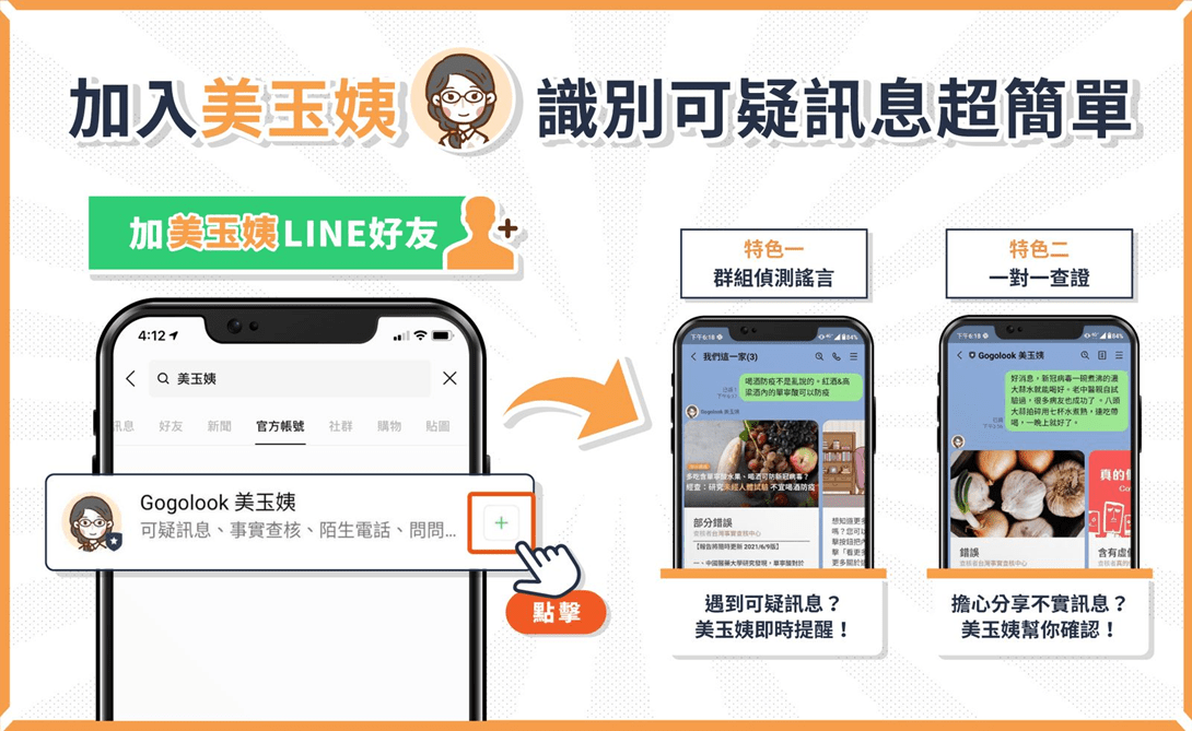 在LINE上搜尋「美玉姨」並加入好友後,用戶不僅可以將其加入多人聊天群組,也能直接在一對一對話中查詢比對可疑訊息,有效降低可疑訊息不當傳散及潛在詐騙的風險。