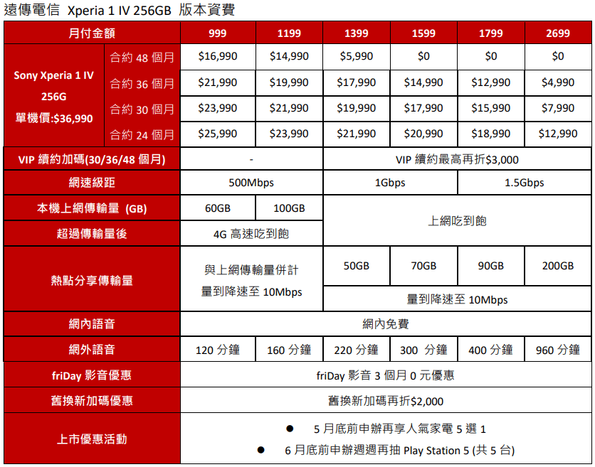 Xperia 1 IV攜手中華電信、台灣大哥大及遠傳電信,共同推出優惠資費方案,512GB ROM版本獨家由中華電信販售,詳細資訊請參考新聞附件