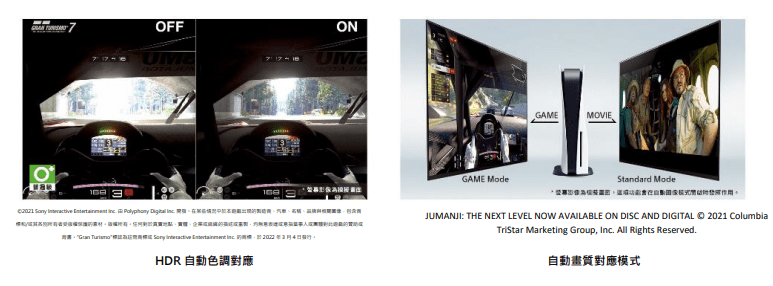 透過「HDR自動色調對應」功能,將支援PS5在初始設定時即自動優化HDR,並於連接時自動辨識BRAVIA XR機種以選擇最適合的HDR顯示,此外而透過「自動畫質對應模式」,BRAVIA XR 能即時偵測PS5TM玩家正在觀賞的畫面並自動選擇適合的畫質模式。