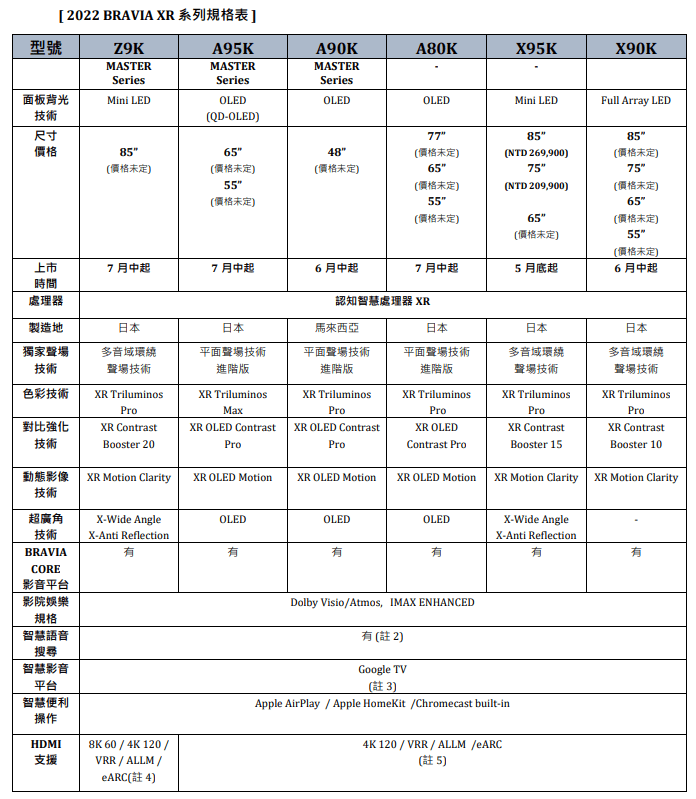 Sony 全新BRAVIA XR全系列於即日起陸續在台上市,建議售價及重點規格請參考下方表格,除Z9K / A95K 系列內附BRAVIA CAM,其餘型號需另外選購(建議售價未定),預計於7月初在台販售。