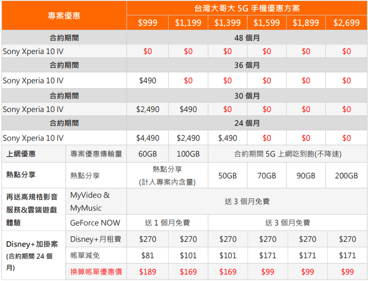 自6月24日起,至台灣大哥大全台服務據點或網路門市選購Xperia 10 IV,申辦999元5G資費方案,綁約48個月,即可享Xperia 10 IV直接0元帶回家!更同時贈送MyVideo、MyMusic等影音服務3個月免費體驗,以及GeForce NOW雲端遊戲服務免費體驗1個月,享受全新的遊玩體驗,滿滿好禮一次帶回家。