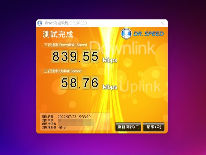 此外小舅子的房間就是圖片中的房間2的位子,透過X18的從路由器插上網路線直供訊號給桌上型電腦主機使用,透過中華電信HiNet測速軟體最快也有跑出下載839.55Mbps / 上傳 58.76Mbps的網速。