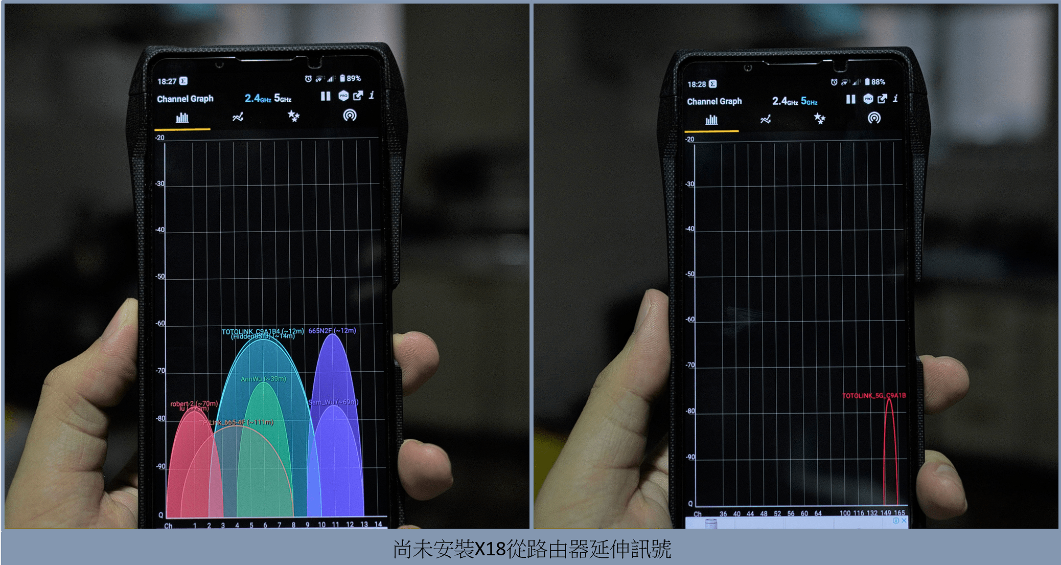 在單靠客廳一台路由器的效力下進行測試,無線網路訊號 2.4GHz 或 5GHz 在 WiFi Analyzer 監測下都呈現不佳,而手機上面的無線網路訊號則是在一至二格來回跳動,因此靠一台穿牆效果真的能力有限。