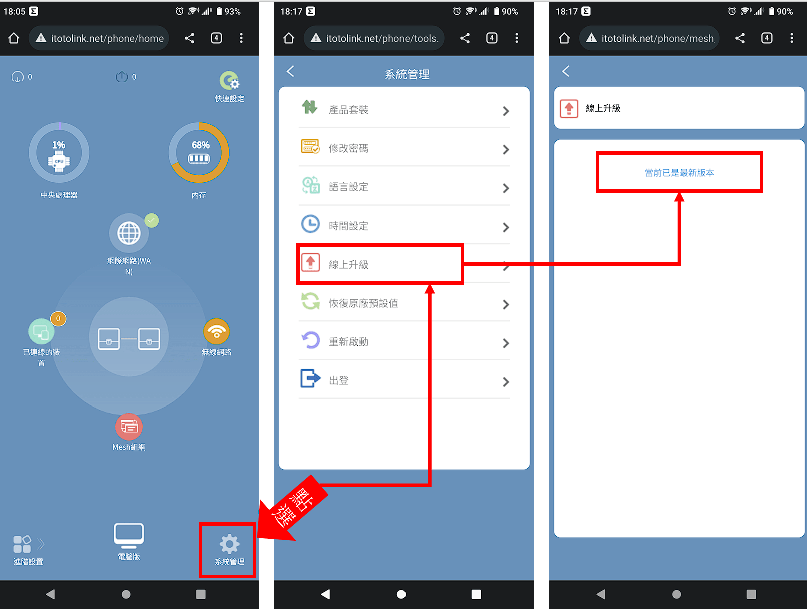 操作方面可以從齒輪圖示的系統管理進入,接著選擇線上升級,接著等它跑完後再開就會完成系統升級。