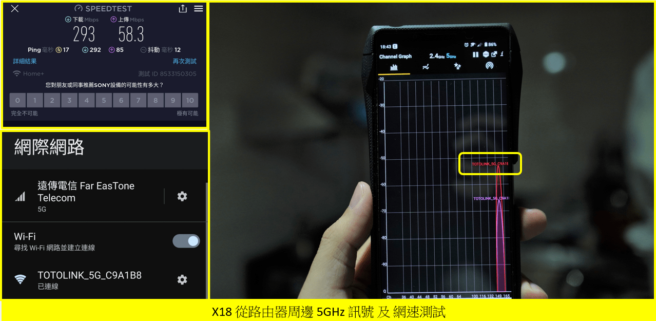 在同樣的情況下切換成 5GHz 頻段測試,經由WiFi Analyzer監測一樣會看見有一組訊號較佳的5GHz網路頻段,手機的無線網路訊號變回滿格,網速部分由SPEEDTEST測試,下載跑出293Mbps 上傳58.3Mbps。