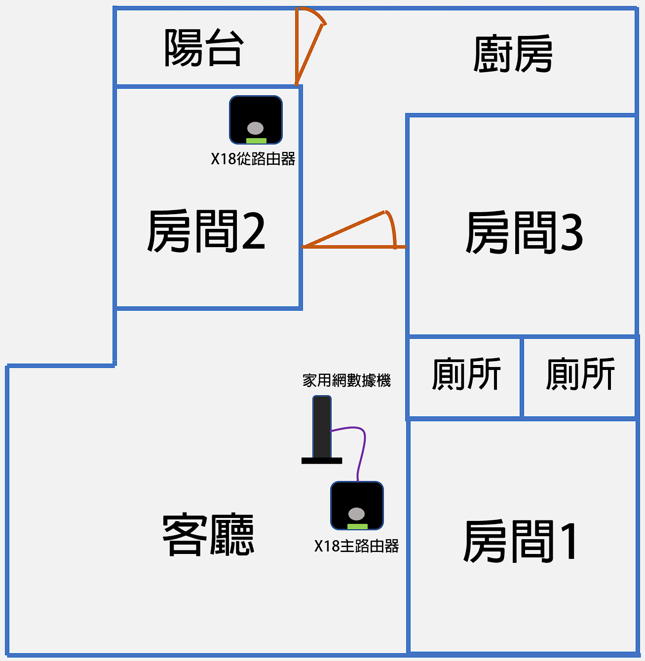 TOTOLINK X18 Mesh網狀路由器的配置方式如凱叔繪製圖解說,在岳父家中室內30坪的空間大小來說,我將 X18 主路由器架設在客廳的家用網路廠商的數據機旁邊,並且先進行訊號測試。
