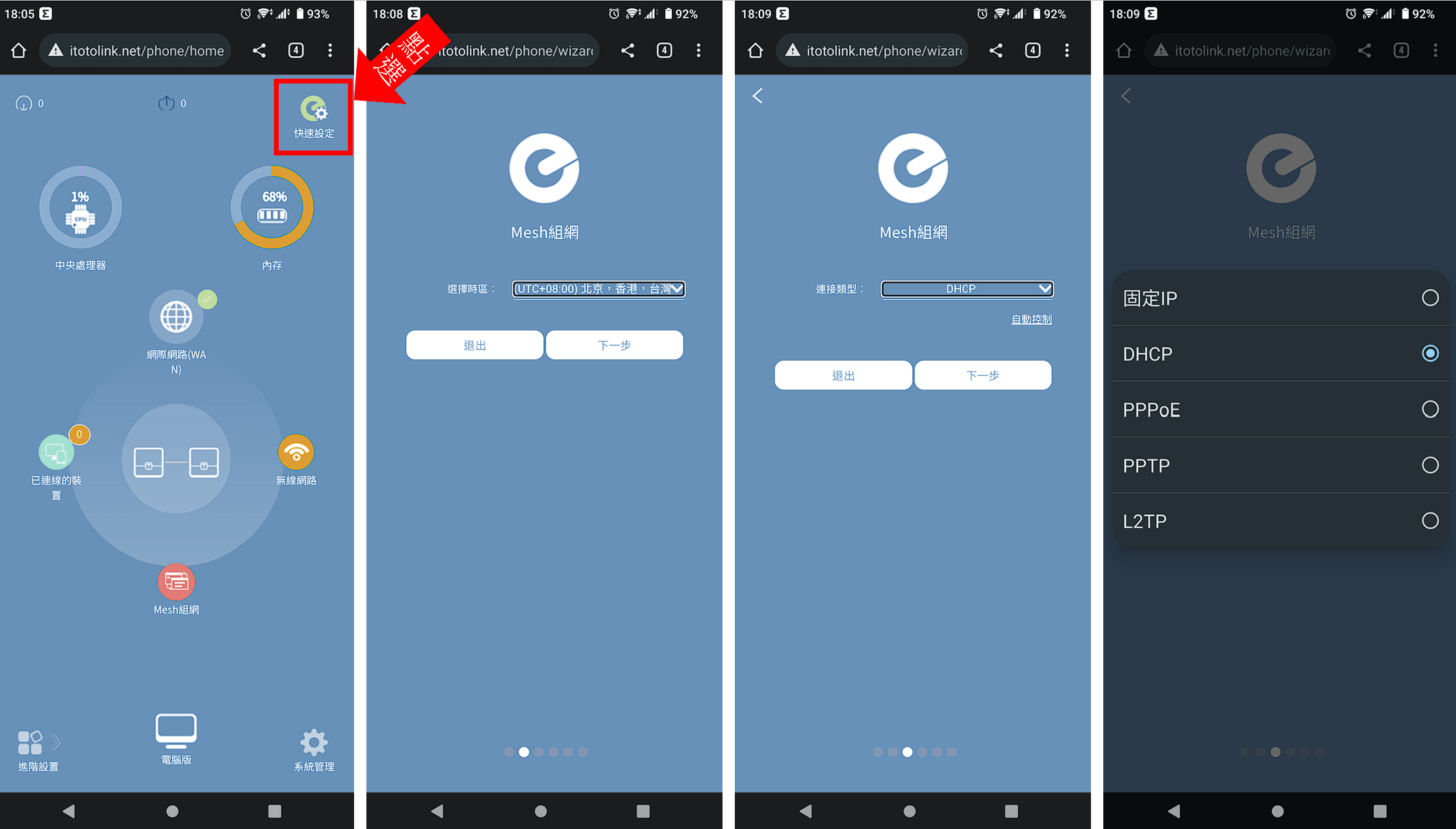 透過操作介面右上角的快速設定,進入後將時間設定在台灣,並且依照連接類型做選擇,一般使用多數可以直接透過DHCP即可。