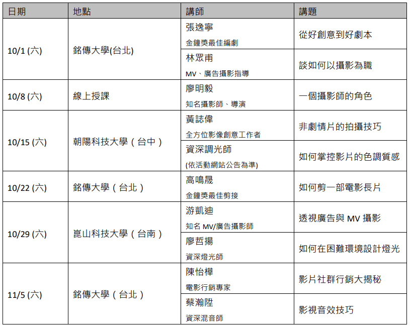 師資陣容來自影視製作產業中各領域金獎級專業人士,並於培訓課程結束後,由專業評審遴選10~12組優秀團隊或個人晉級至影片創作競賽階段。