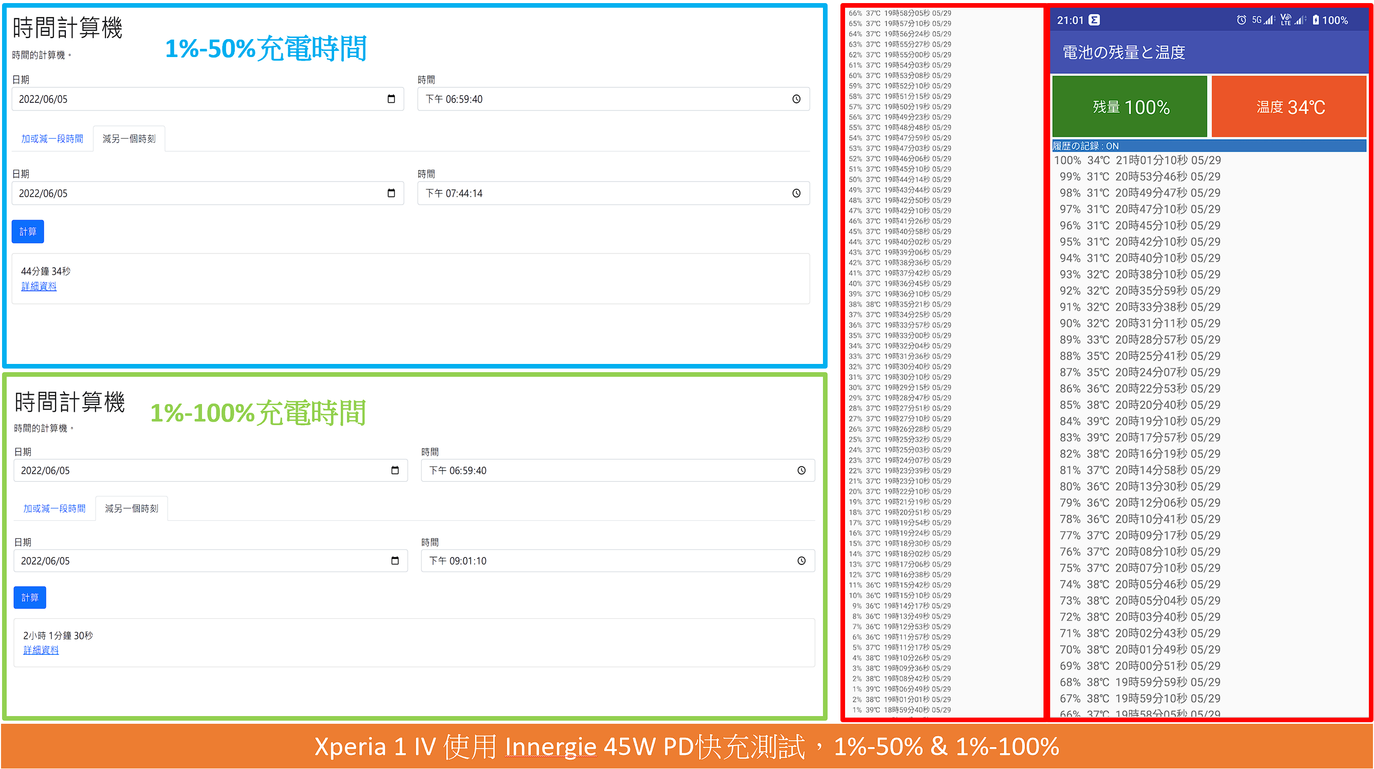 - 1%充電 至 100%大約花費2小時01分。
