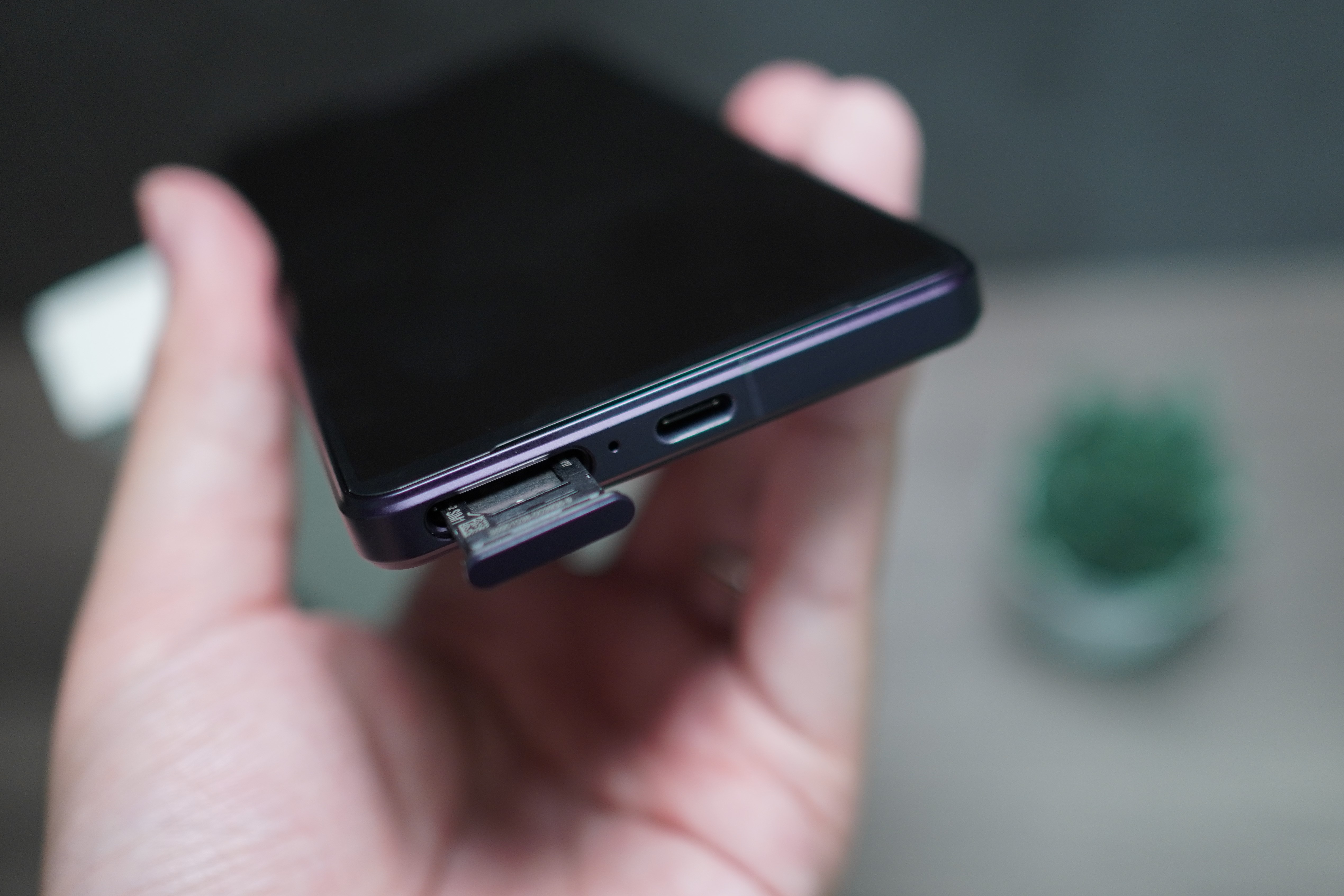 卡托採用二擇一設計,可放兩張SIM卡或一張SIM卡與記憶卡(最大支援1TB),位置的部分改到手機底部,並且一貫維持不需要退卡針的便利設計。