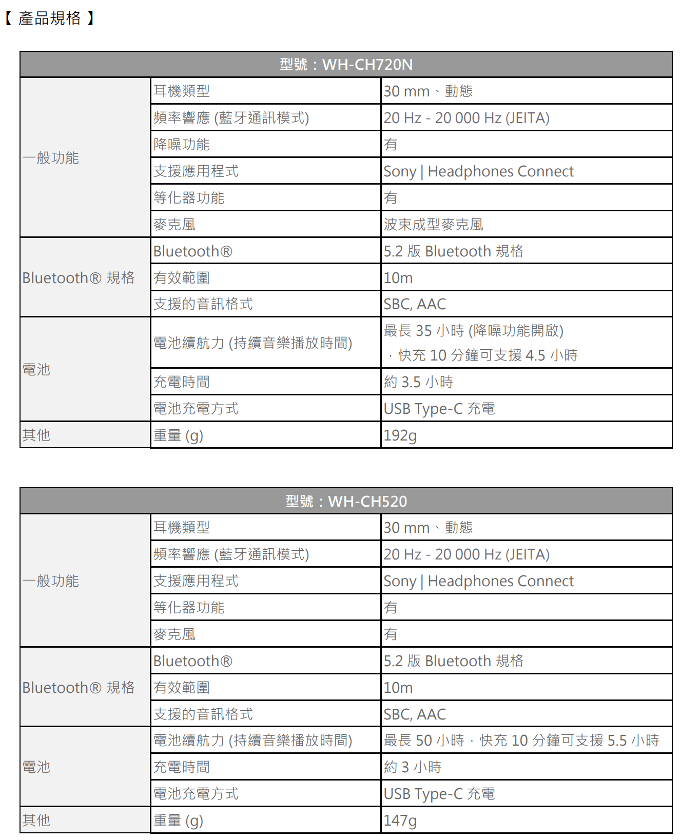 在配戴上WH-CH720N更是Sony有史以來最輕的無線降噪耳罩式耳機,以更輕巧的機身設計搭配降噪模式開始還能維持長效35小時的電池續航力,為樂迷帶來超值選擇。