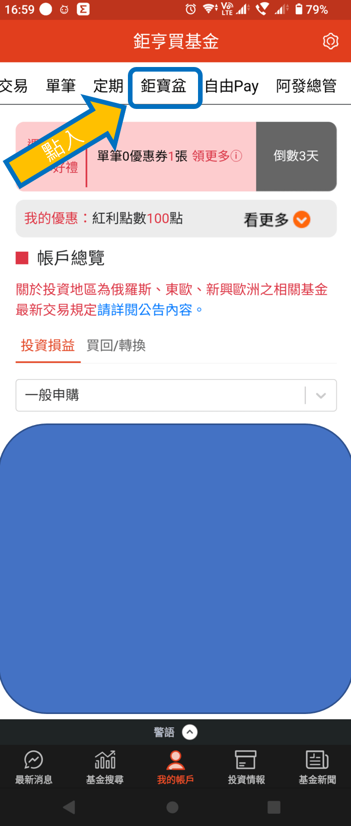 操作方式也很簡單,鉅亨買基金投資專屬app,打開後從我的帳戶上方可以看見【鉅寶盆】,這個就是鉅亨買基金平台推出的母子基金投資設定處。