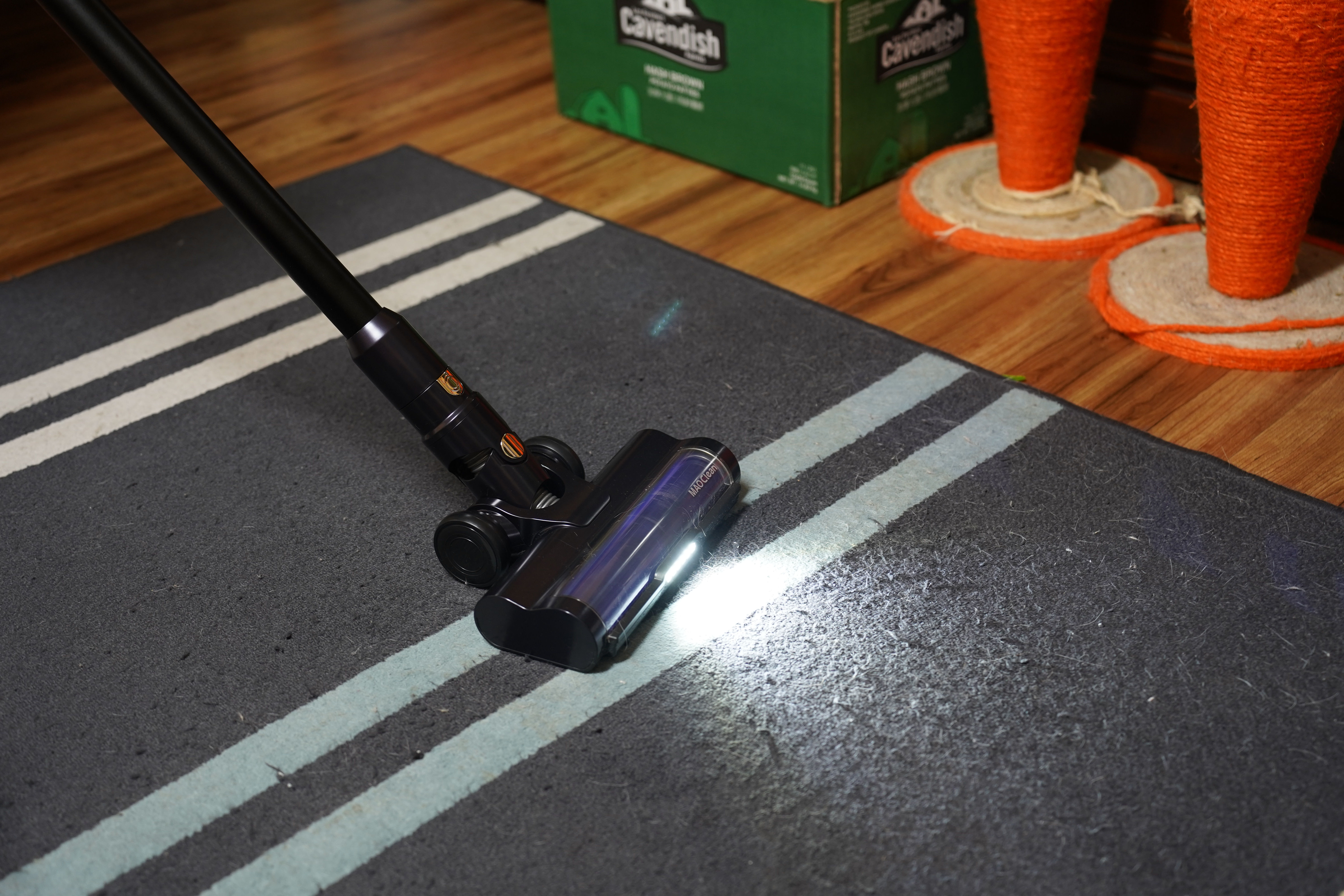 吸頭上方的大滾輪移動相當滑順且安靜,並且前方有LED照明燈,讓使用者可以在沙發底下或桌底等陰暗處,也都能看的清楚吸的乾淨。