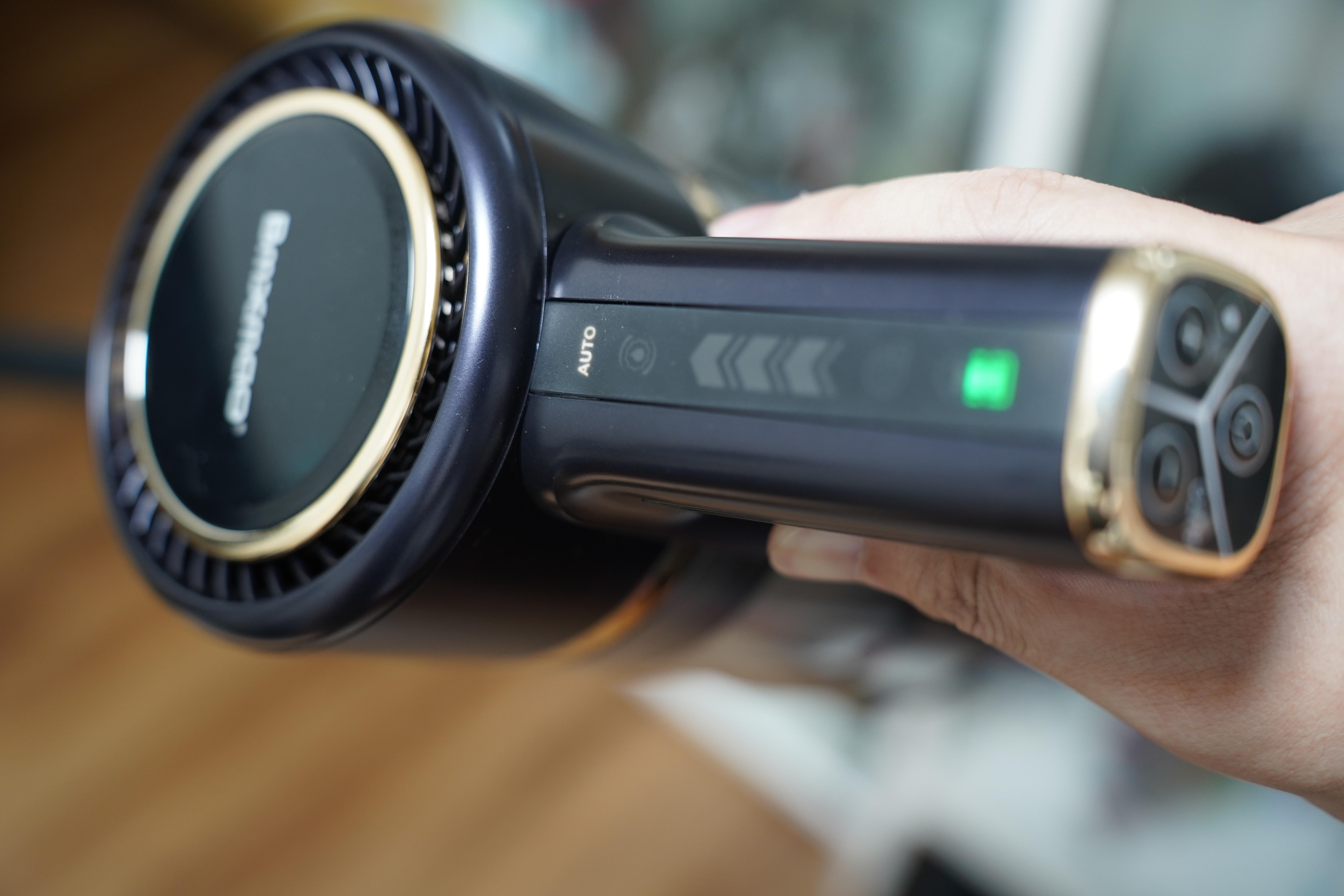 吸力大小透過配置的【+、-】鍵調整,強弱會在機身上方以LED燈號呈現,新一代130000轉DC無刷馬達,低噪音、吸力不衰退,最大吸力可以達到28kpa,相當強勁。