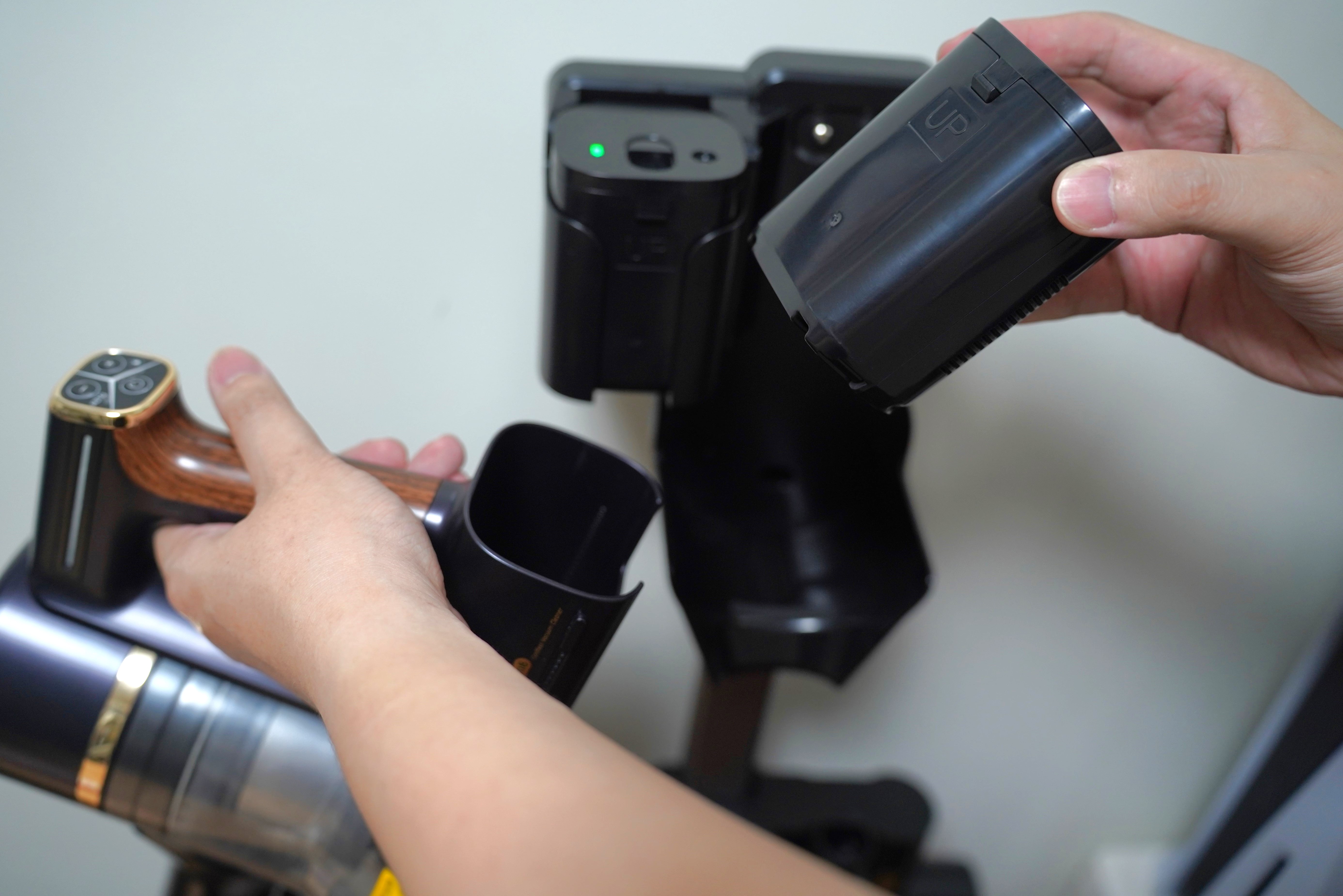 MAO Clean M8的可替換電池設計,那怕是透天厝也不用擔心打掃到一半沒電還要花時間等充電;打掃結束後放回收納架上,放置家中也是相當好看。