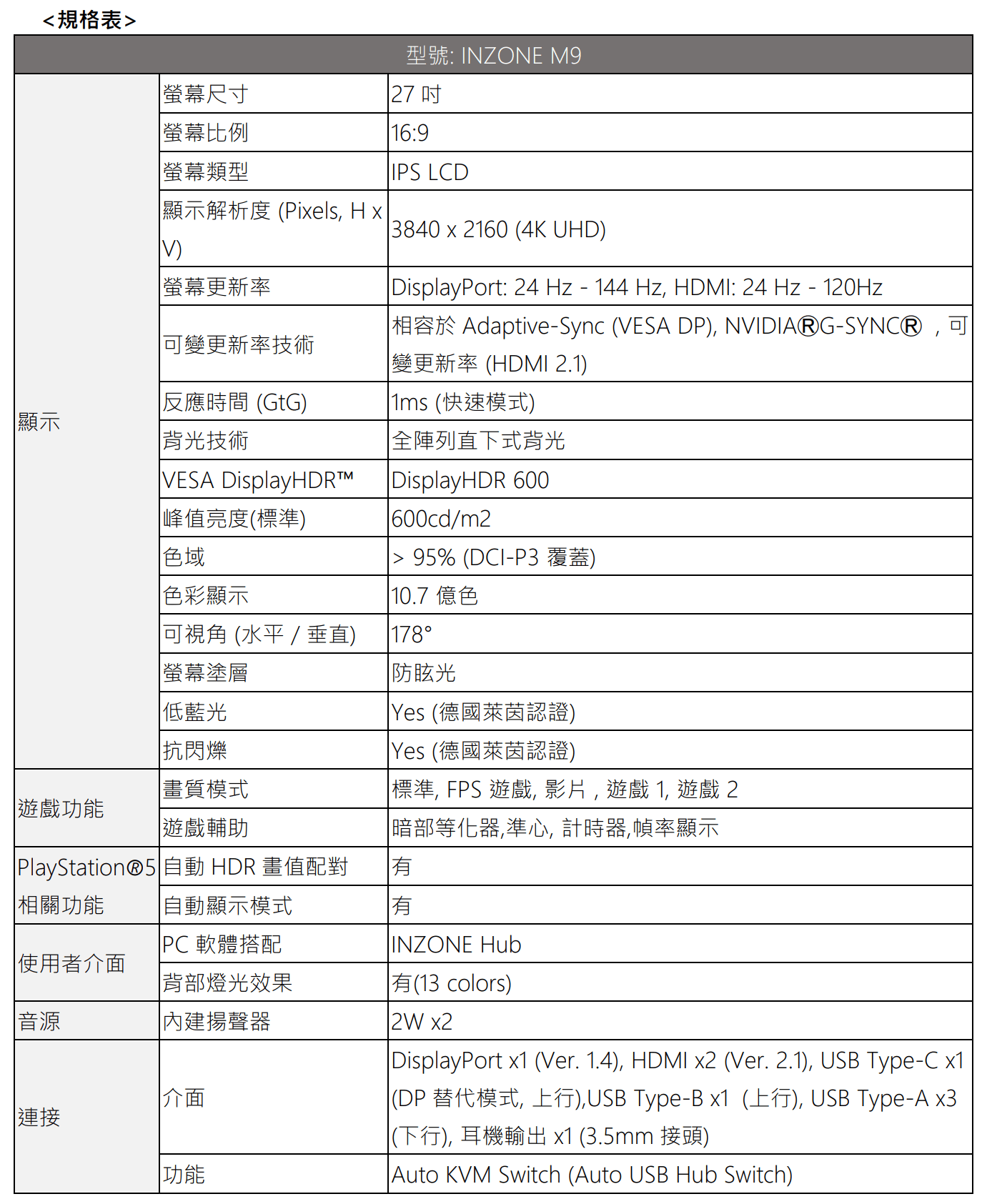 INZONE M9具備4K高解析畫質加上全陣列式背光技術,超過95% DCI-P3 的色域覆蓋率再現高達10.7億種的色彩和DisplayHDR 600的高峰值亮度,此外更配備高效能的144Hz螢幕更新率和IPS 面板僅1毫秒的反應時間,並且支援可變更新率功能,全力提供玩家更身歷其境的即時體驗。