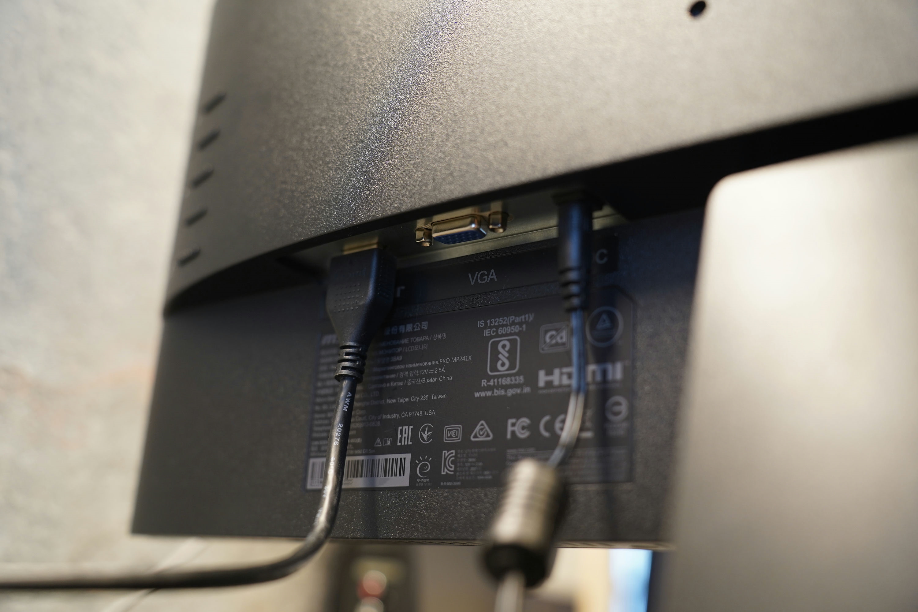 MSI PRO MP241X的連結埠提供VGA與HDMI各一個,可以針對新、舊款的電腦進行連結,最後把電源線接上去DC的位子就能準備開始使用。