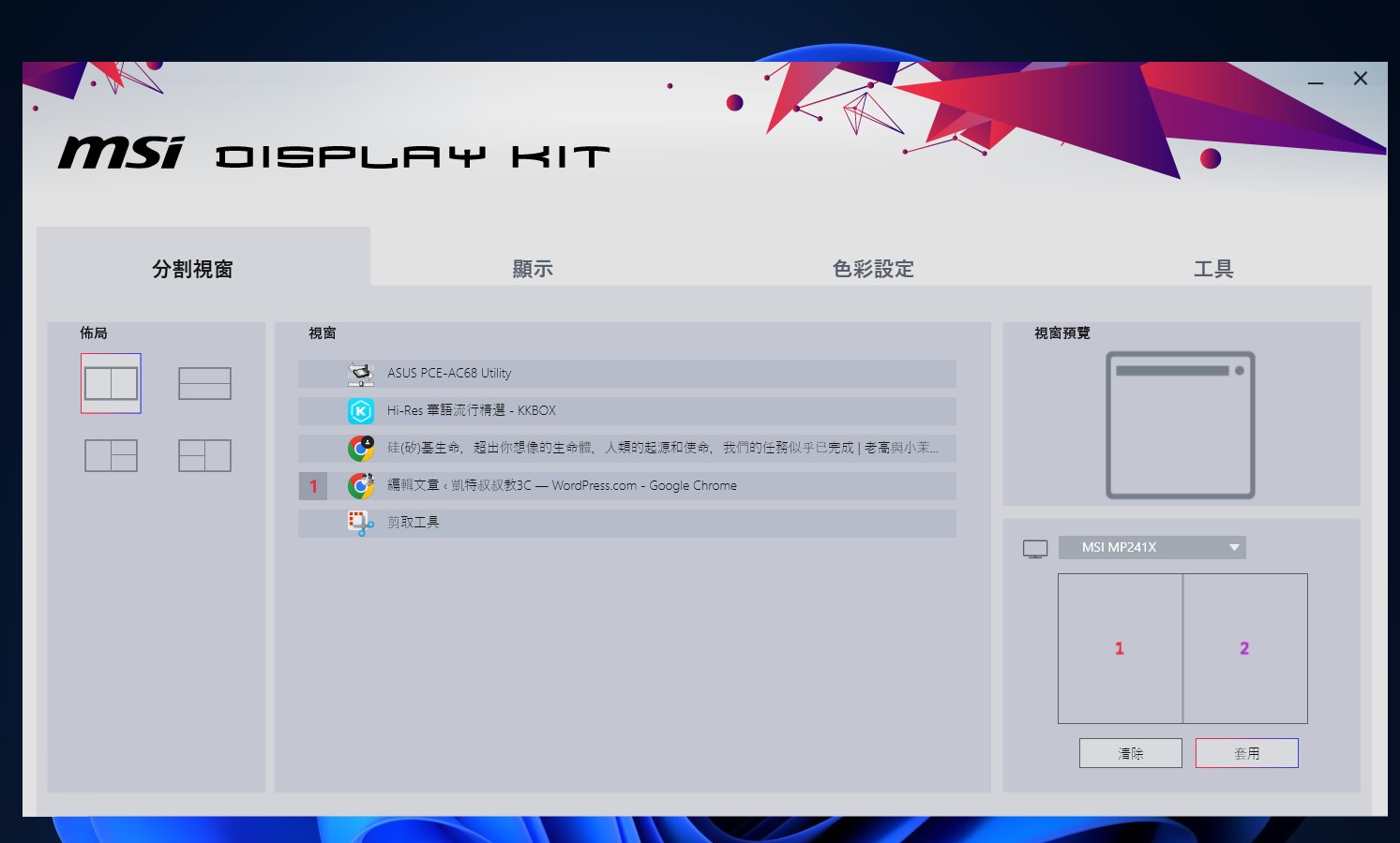 透過Display Kit可以快的讓電腦螢幕跟智慧型手機一樣達到多工作業的效果,就不用自己在手動開兩個程式調整大小,一邊開網頁新聞,一邊開啟股票看盤軟體,這功能對早上在做股票的人來說還滿方便的。