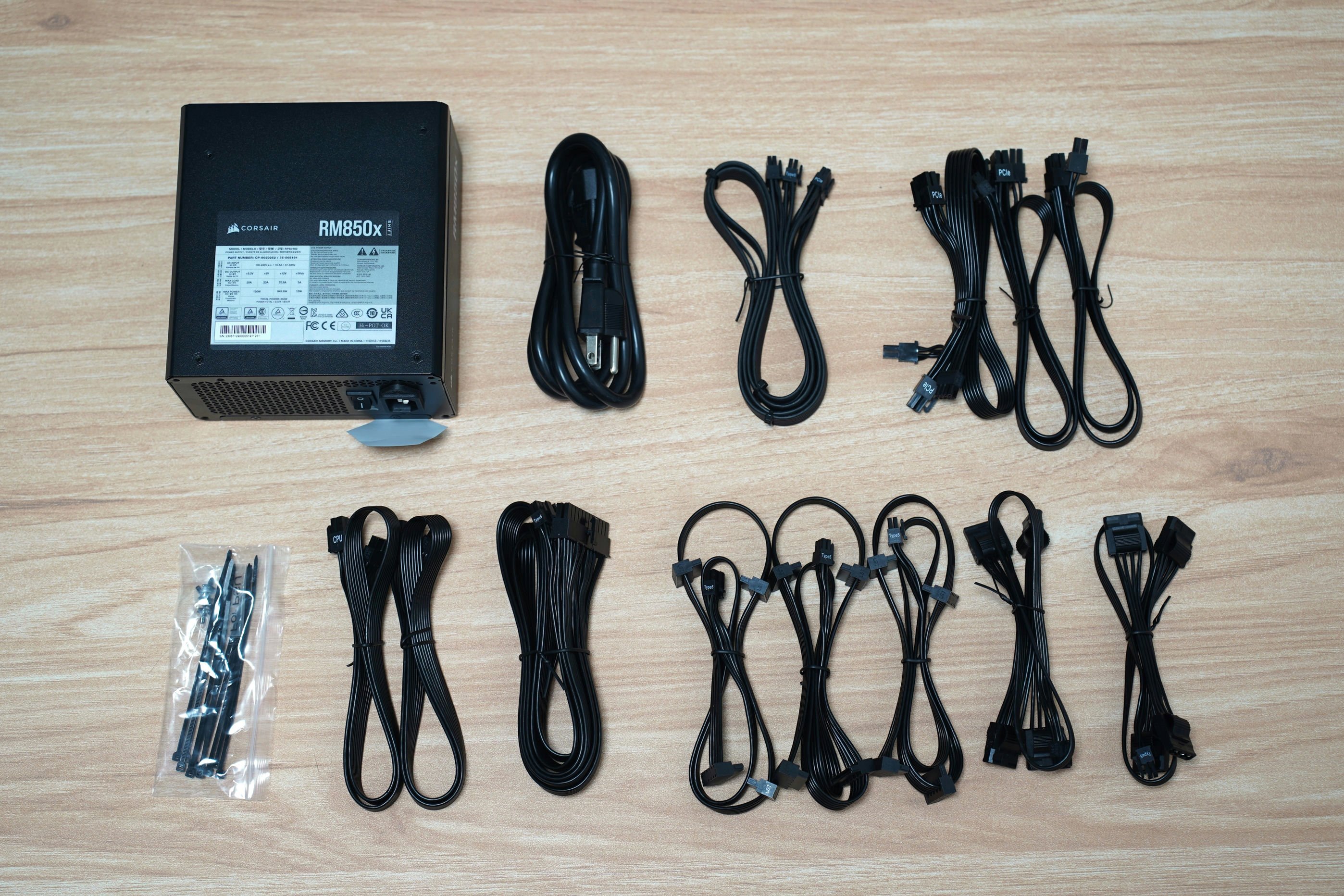 打開CORSAIR RM850x Shift 的盒裝可以看見線材給的相當齊全,除了各類硬體需求的電源線之外,還有一包貼心的束帶方便整線使用。