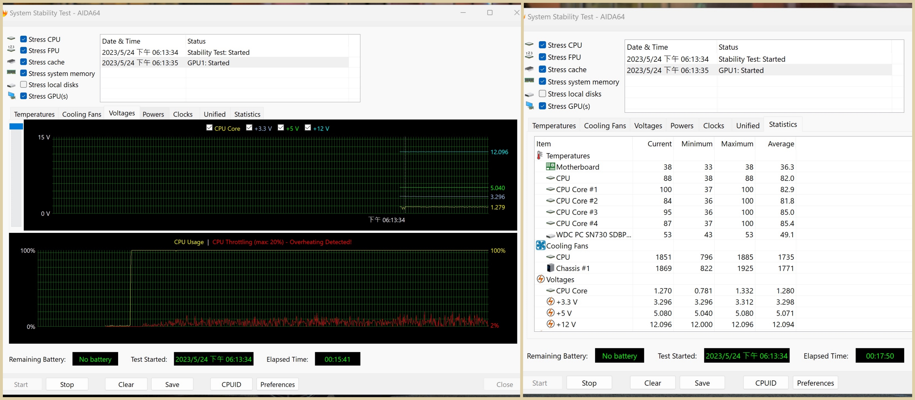 當電腦設定超頻使用AIDA64進行17分鐘的燒機測試電壓表現。