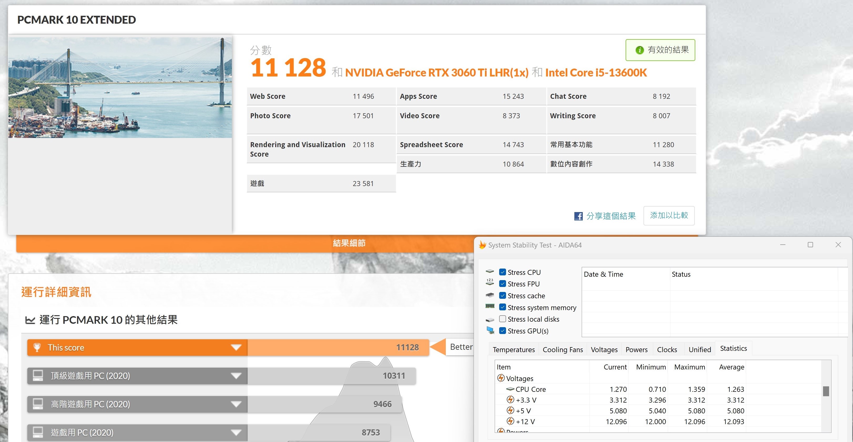 PCMARK10 EXTENDED 多種情境模擬的30分鐘測試,同時開啟AIDA64紀錄這區間的電壓表現。