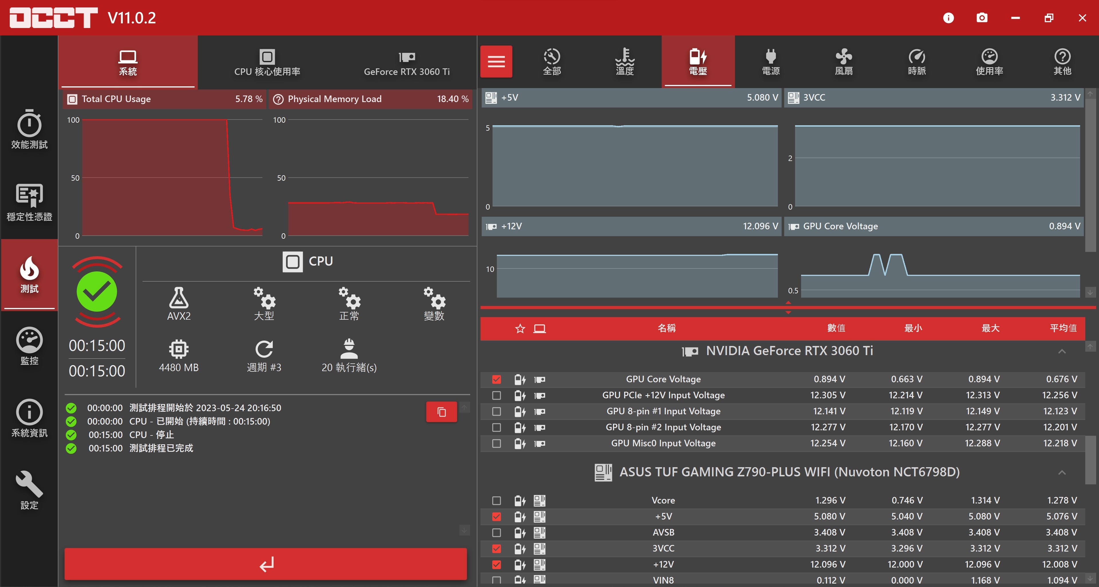 首先以常拿來測試電腦組裝後電壓是否穩定的OCCT進行燒機測試,實際燒機15分鐘,整體來說跳動不大,相當穩定。