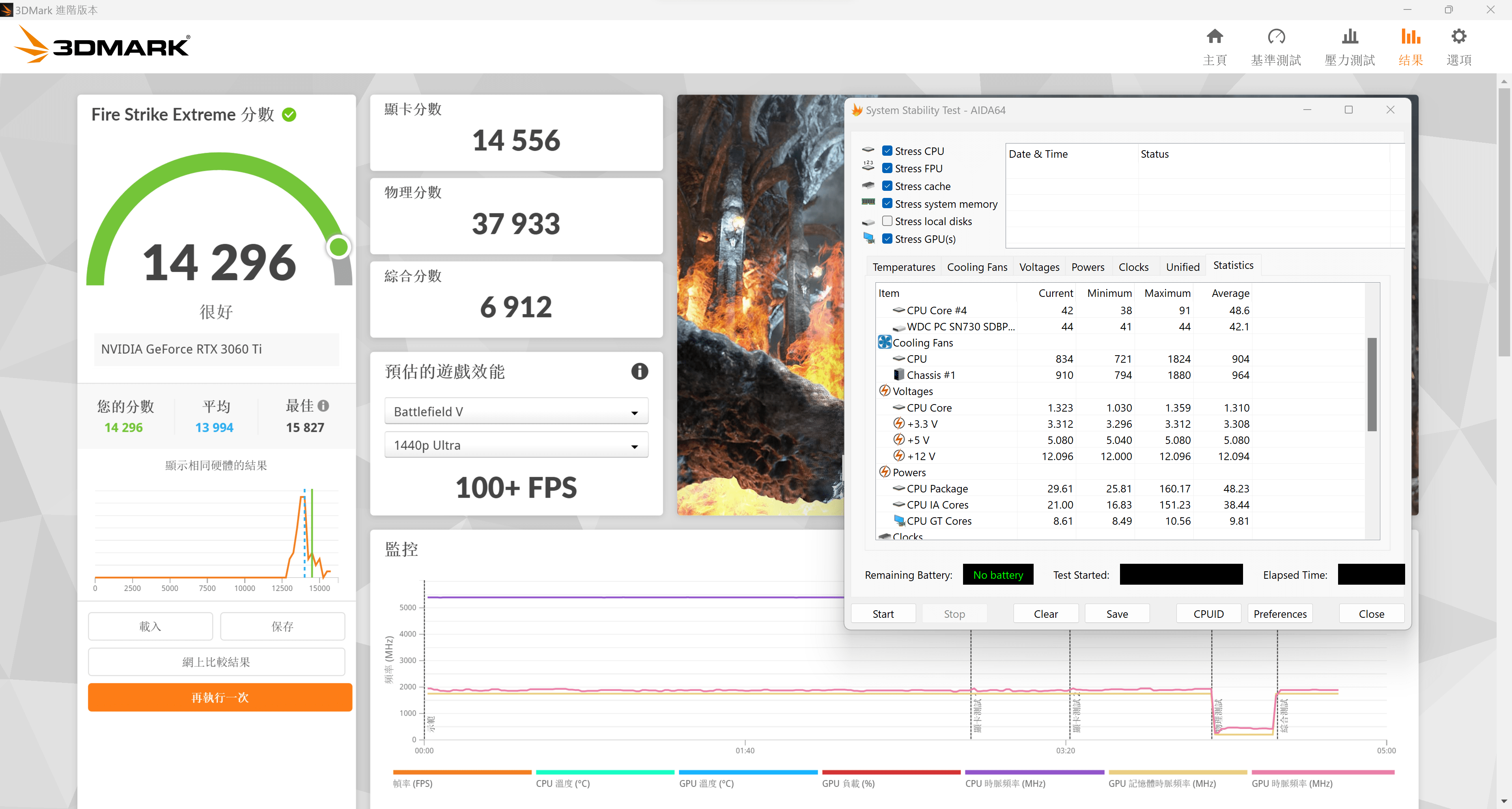 3DMARK 進行Fire Strike Extreme 測試,同時開啟AIDA64紀錄這區間的電壓表現。