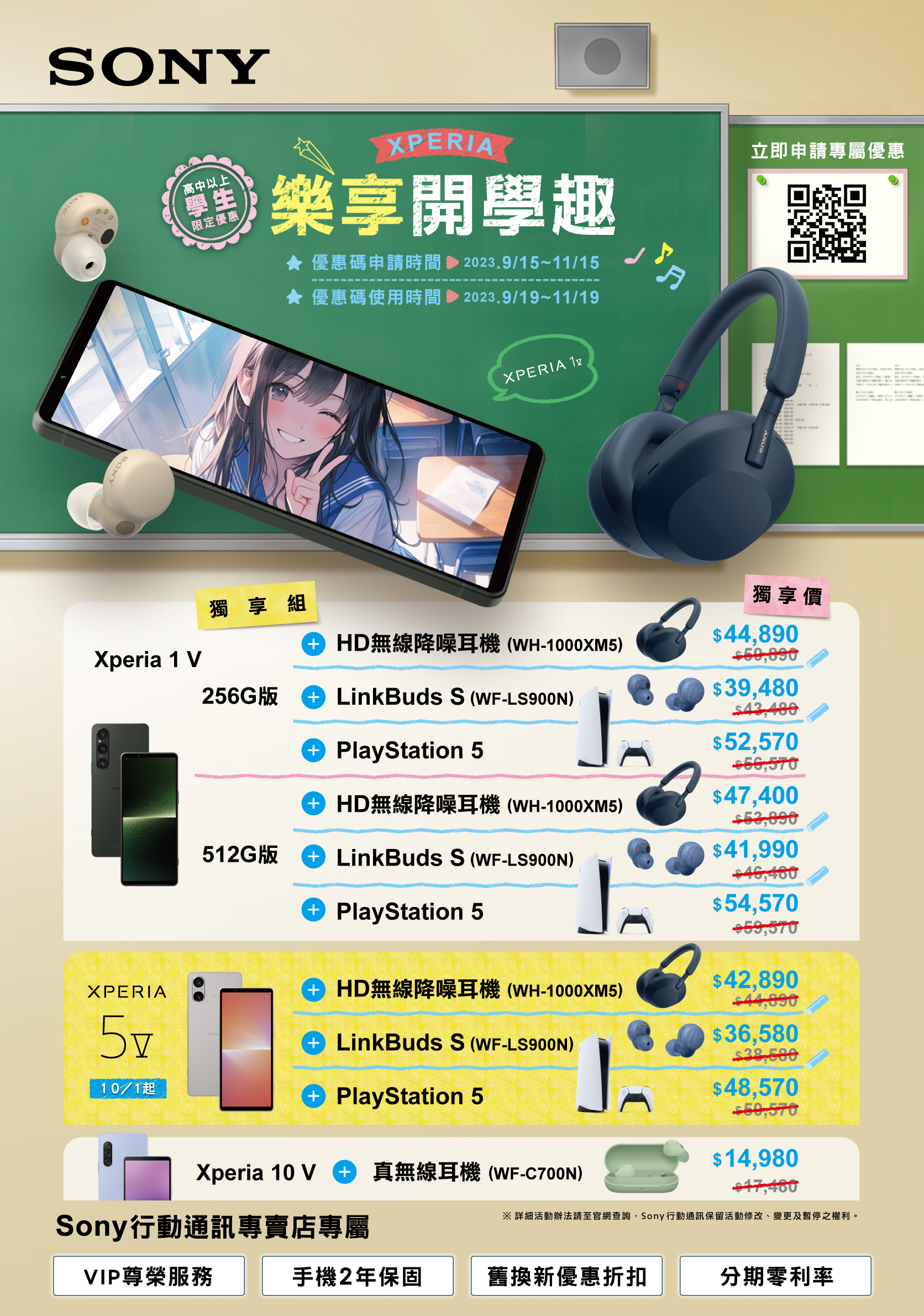Xperia學生專屬購機優惠組合開跑後好評如潮!即日起至2023年11月19日,高中以上學生於Sony直營店或Sony行動通訊專賣店申請並使用優惠碼,選購Xperia系列手機,即可以最高折NT$6,490的超值優惠價格搭購Sony超人氣指定商品。