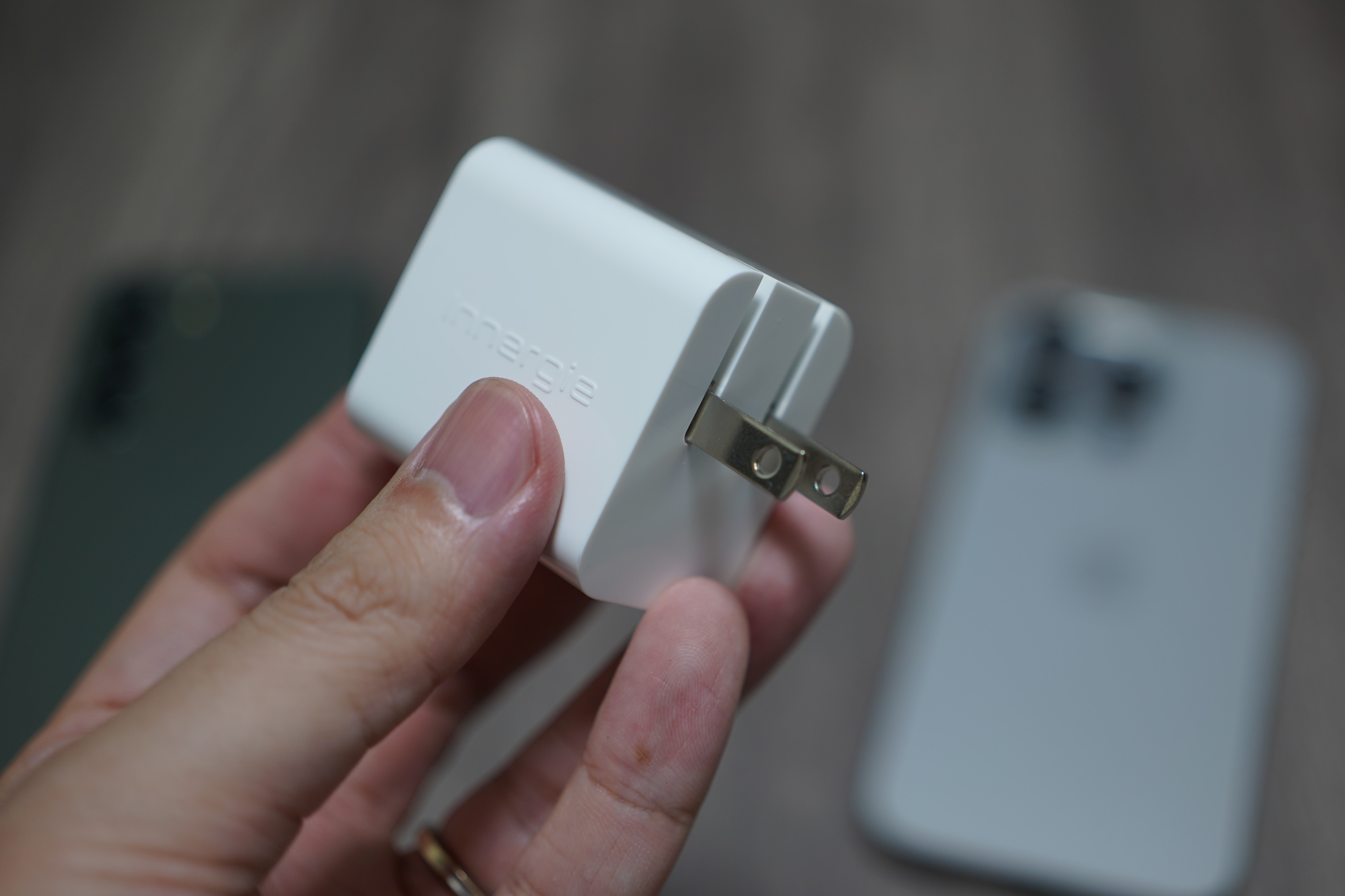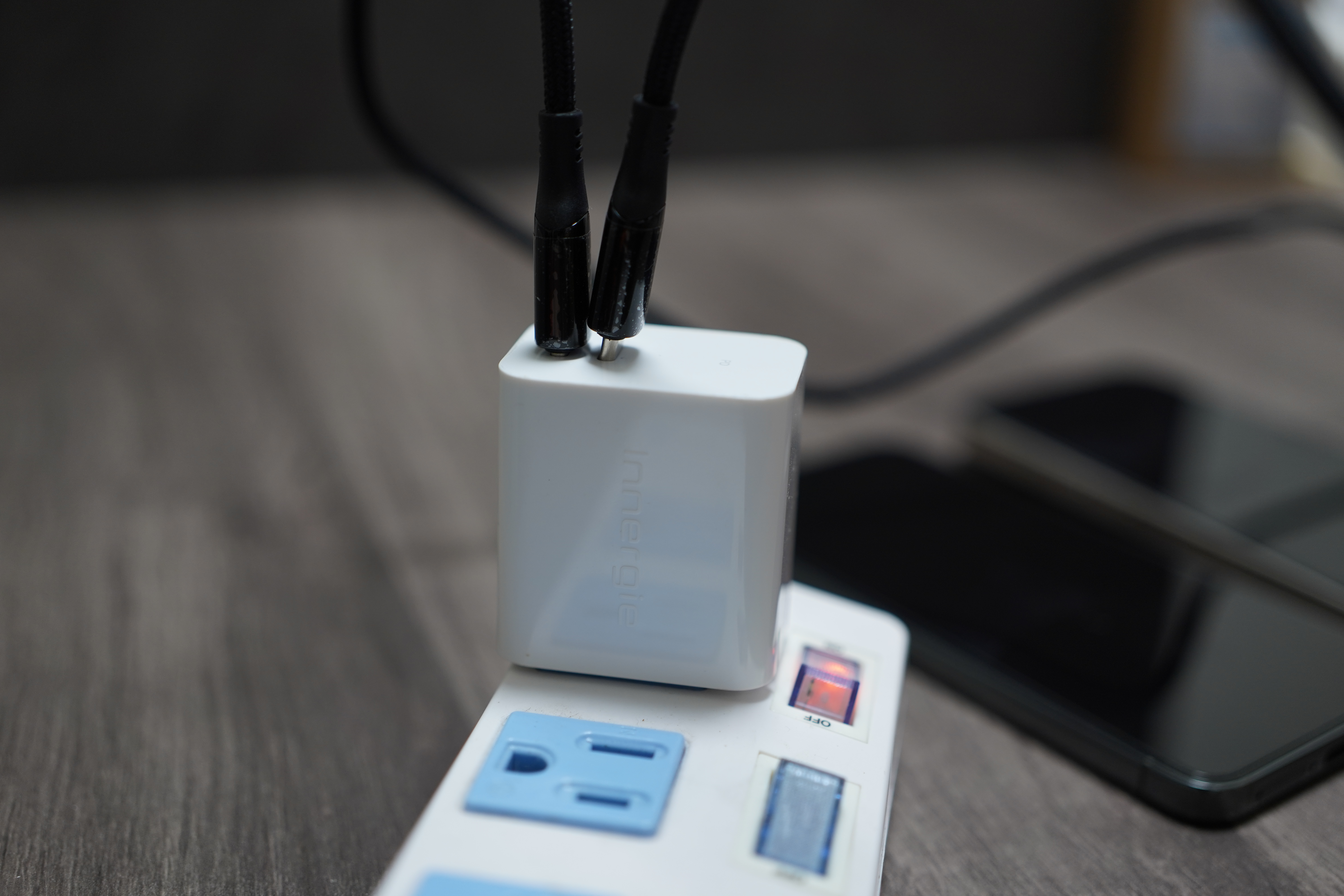 在測試的時候有碰到一個意外小插曲,就是手上Innergie C4 Duo這款它兩個USB-C的插孔位子做的比較接近,因此你的充電線剛好是線頭比較粗的,可能會碰到跟我一樣無法同時使用的問題。