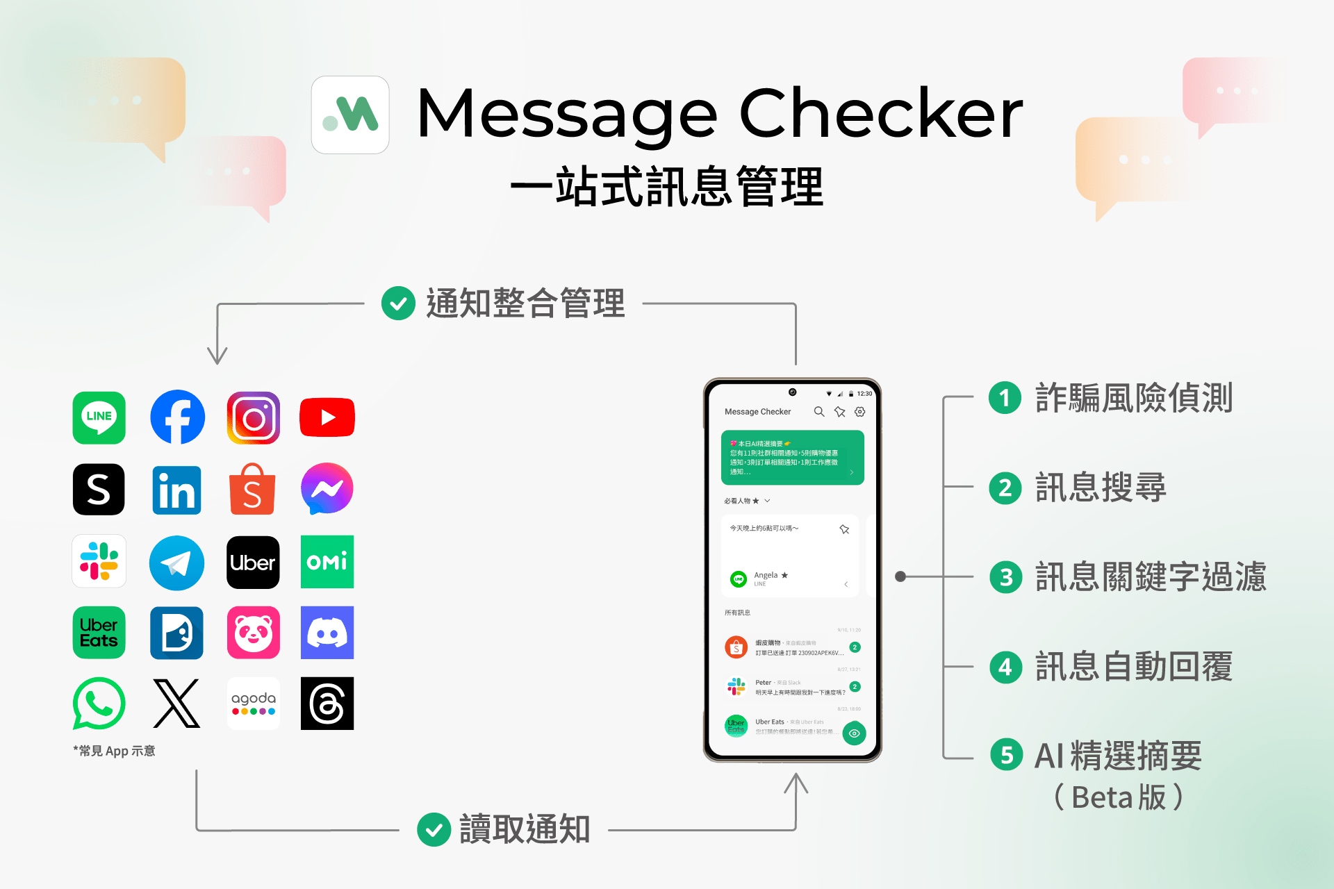 在詐騙場景不斷擴張下,Message Checker 運用 AI 技術與 Gogolook 防詐資料庫為基礎,專注於針對訊息通知的性質進行分類及過濾,面對每日上百則的通訊軟體訊息、社交軟體動態回應、銀行最新優惠提醒、股票漲跌通知等,Message Checker 希望能成為用戶必備的訊息通知管理助手,從風險偵測、訊息過濾、搜尋到自動回覆,提供 Android 用戶一站式的創新訊息管理體驗。