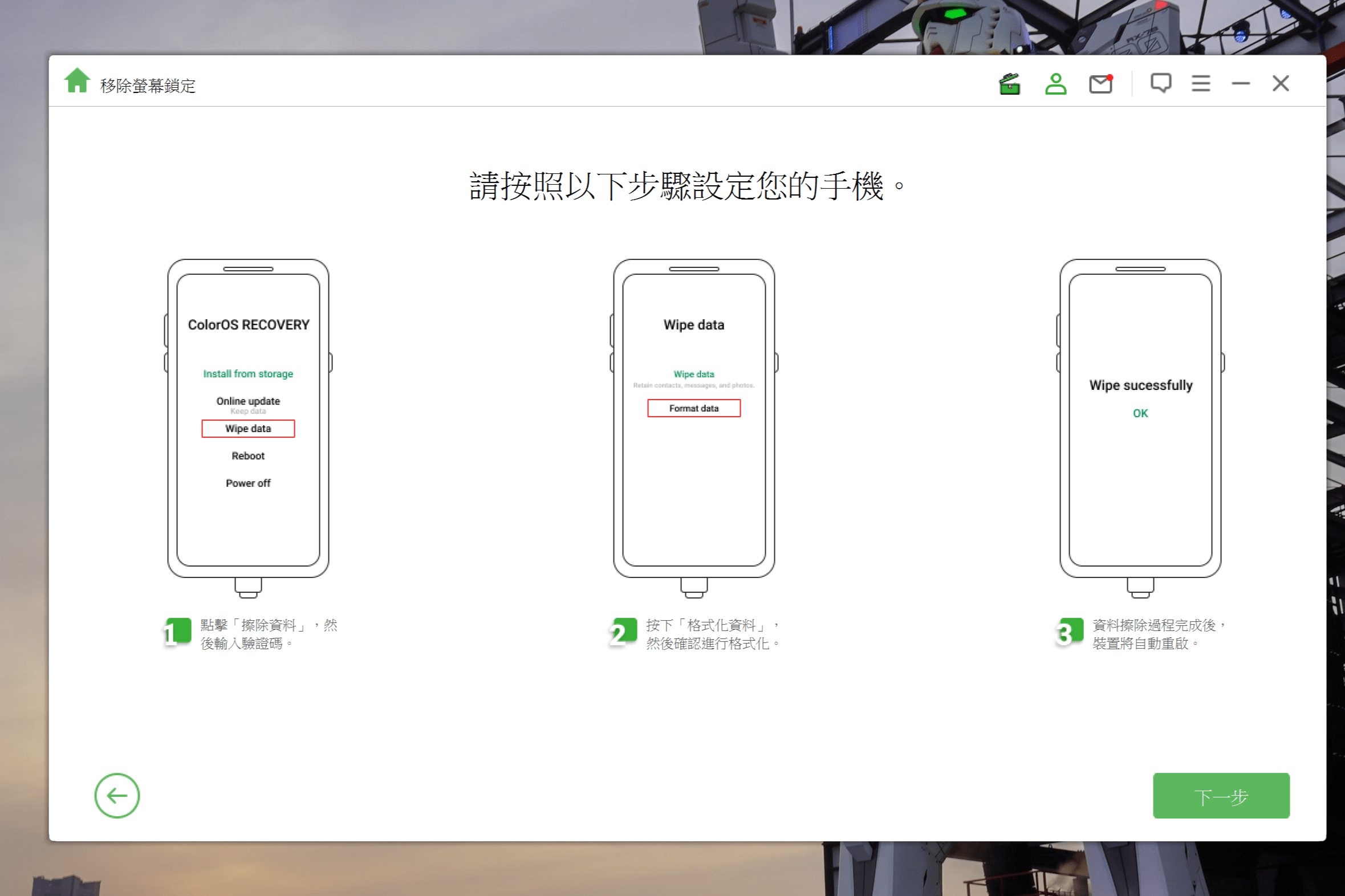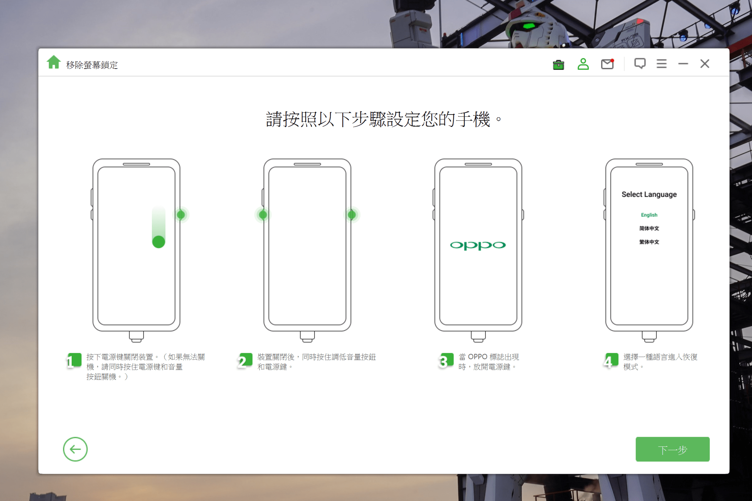 以這次是要進行 OPPO 螢幕鎖定解除 ,因此進入後就會看到他的引導操作,照著流程進入手機工程還原模式。