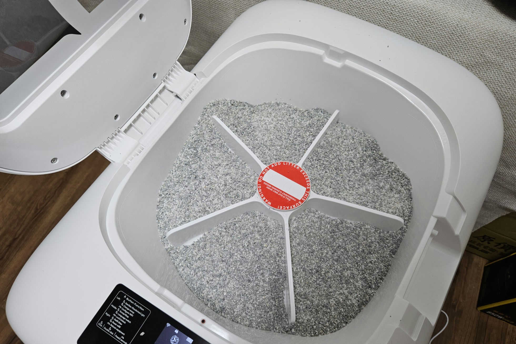 機身頂部的自動加砂艙,每格空間可倒入1.2kg的貓砂(加滿共6kg),當機器偵測到下方貓砂盆的貓砂量不足的時候,就會自動從加砂艙補充貓砂到下方的貓砂盆內,達到一個真正減輕鏟屎官工作量的負擔,也能精準控制貓砂用量,真的是很方便。