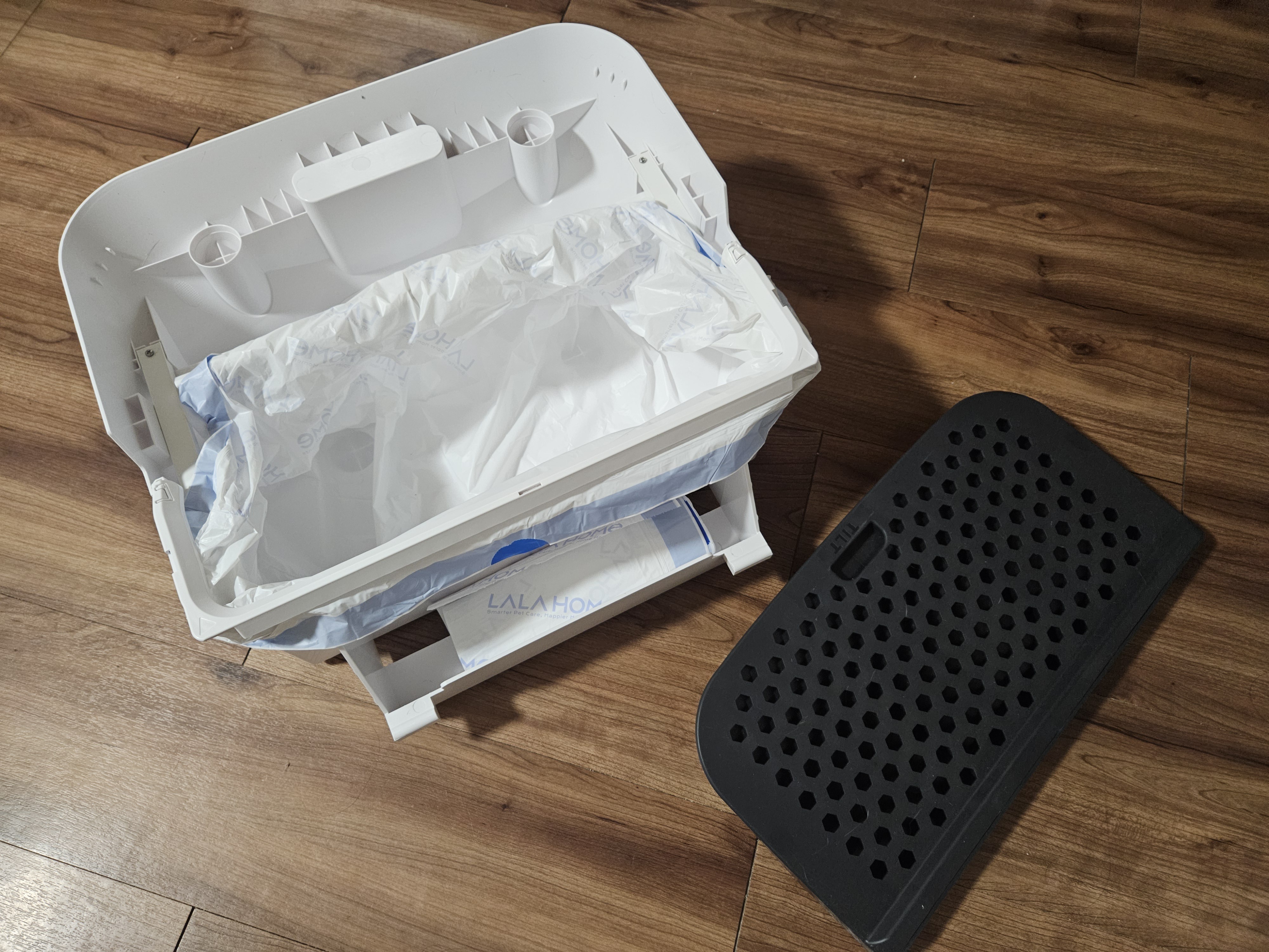 集便倉大約8L大小,以單一隻貓的正常用量大約可以裝載1週的屎、尿貓砂量,並且跟落砂墊一樣是可以拆去清水清洗。