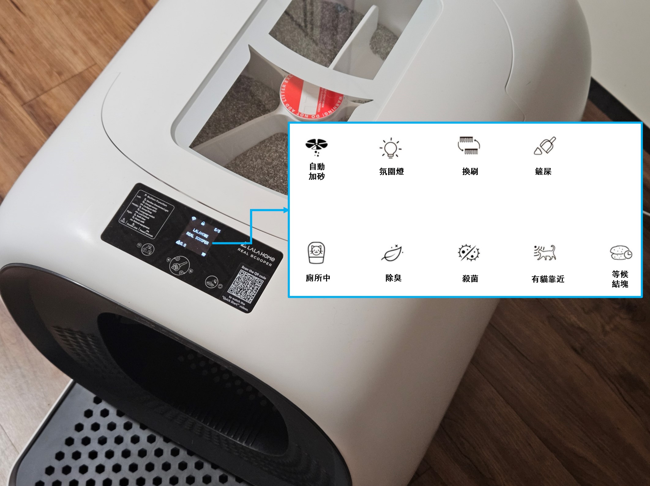RealScooper 智能貓砂盆本體上方有一塊顯示螢幕,顯示內容採用圖像化,不同的圖案對應功能解說,其實還滿直覺明瞭的,基本上看過一次就能快速上手。