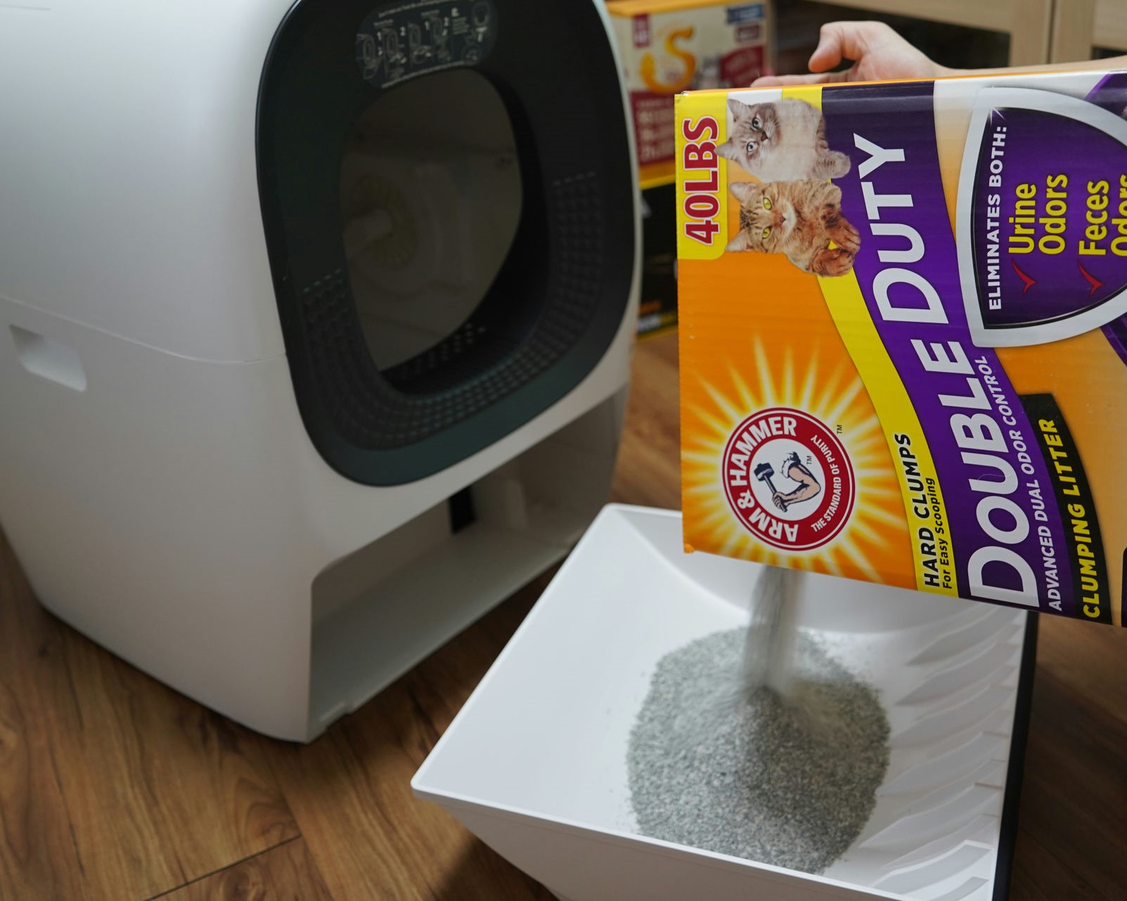 RealScooper 智能貓砂盆適用於市面上多數可以凝結塊狀的礦物砂 (不建議使用水晶砂、木屑砂、豆腐砂),抽出機身底部的貓砂盆倒入貓砂到指示刻線處即可,並且這塊貓砂盆使用一段時間也是可以拆去清水沖洗。