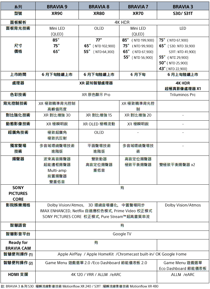 Sony 全新BRAVIA系列已陸續在台上市,建議售價及重點規格請參考上方規格表,更多產品訊息請洽全台 銷售通路。