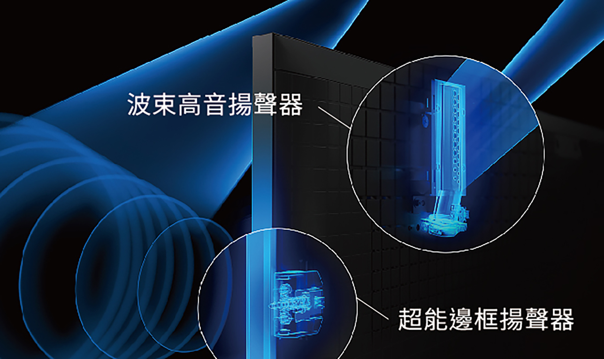 BRAVIA 9系列在音效上更祭出了全球首創的旗艦級強大規格,配備波束高音揚聲器可朝上投射音效,透過天花板反射能打造彷彿從頭頂傳來的環繞音效,再搭配兩側可朝前投射沉浸式音效的超能邊框高音揚聲器,更強化了「多音域環繞聲場技術進階版(Acoustic Multi-Audio+)」的表現,精準呈現與畫面相符的聲音定位效果並增強環繞音場,完美實現影音合一的劇院級沉浸音效。