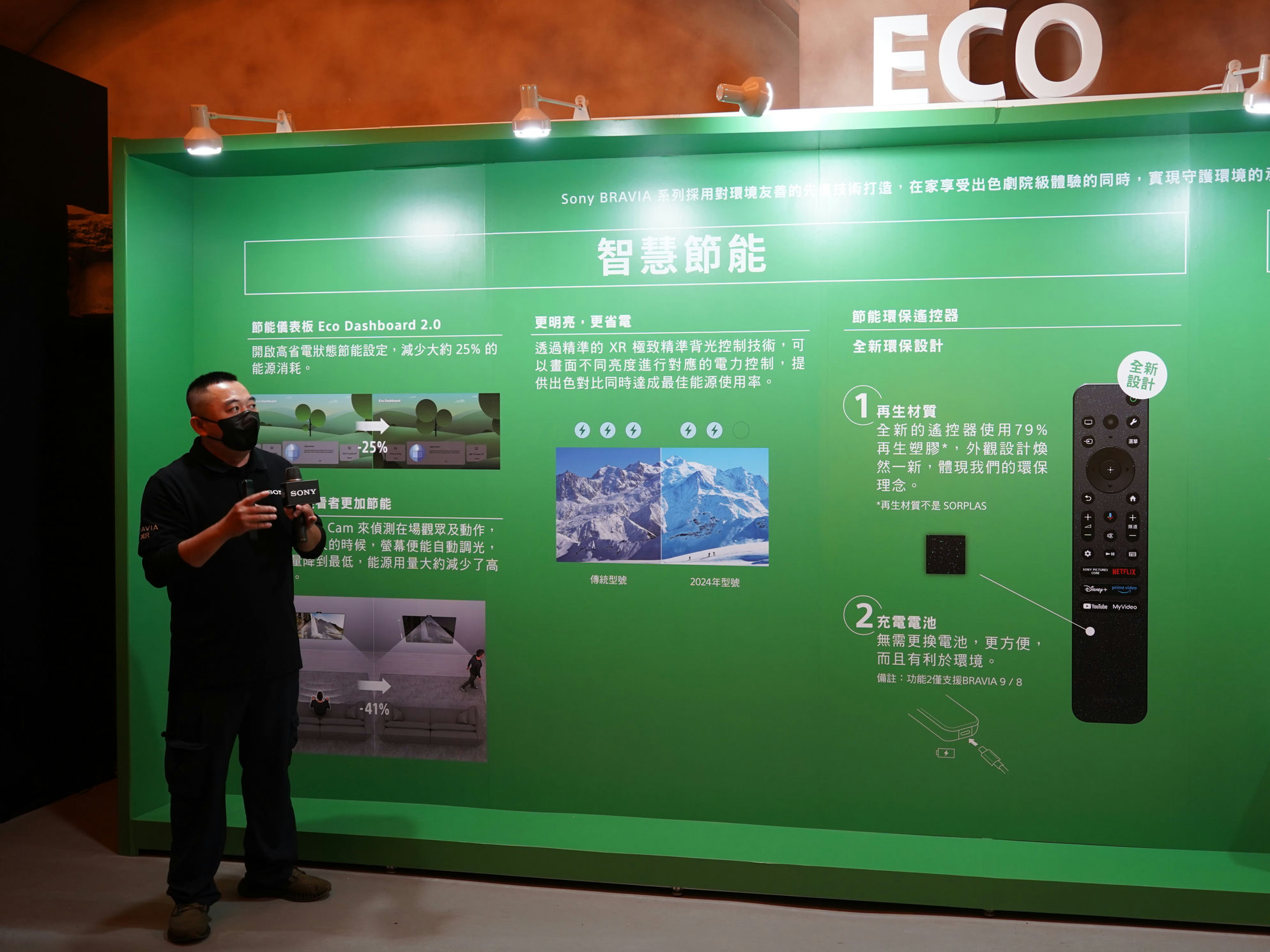 BRAVIA 9 / 7系列使用 Sony 的獨家訊號處理技術並結合XR極致精準背光控制,可最高效地發揮Mini LED面板特性,自動優化每個場景亮度並降低耗能。BRAVIA 9 / 8/ 7系列內建更進化的節能儀表板2.0 (Eco Dashboard 2.0),可輕鬆設定和管理各種節能項目並快速檢查電量和節能提示,開啟高省電狀態節能設定,亦可減少大約25%的能源消耗,一鍵就能即刻響應環保。此外,搭配獨家BRAVIA CAM即可偵測當螢幕前沒有觀看者時,能自動調整亮度降低耗電,最高可有效減少41%用電量。