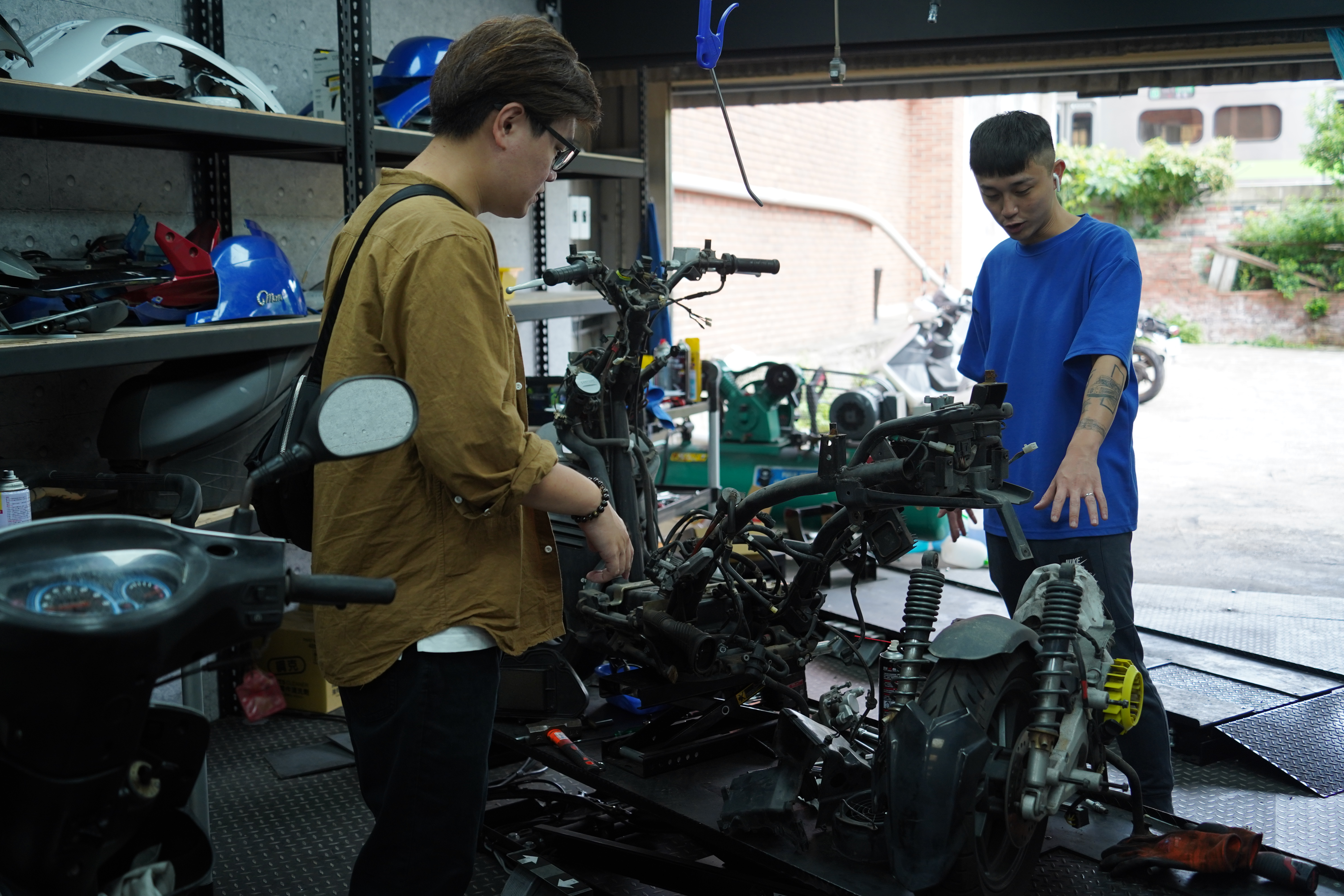 店長說明保固完之後也帶我到整備保養區參觀,以二手機車買賣經營來說,技師並不是只會單純拆引擎或變速箱維修就好,因為貳輪嶼還有收購後的二手車輛需要整備販售,因此他們的技師都是嚴格挑選過的,需要精通電系、機械引擎、吃油吃電的車都要會維修才能在這邊幫客戶服務。