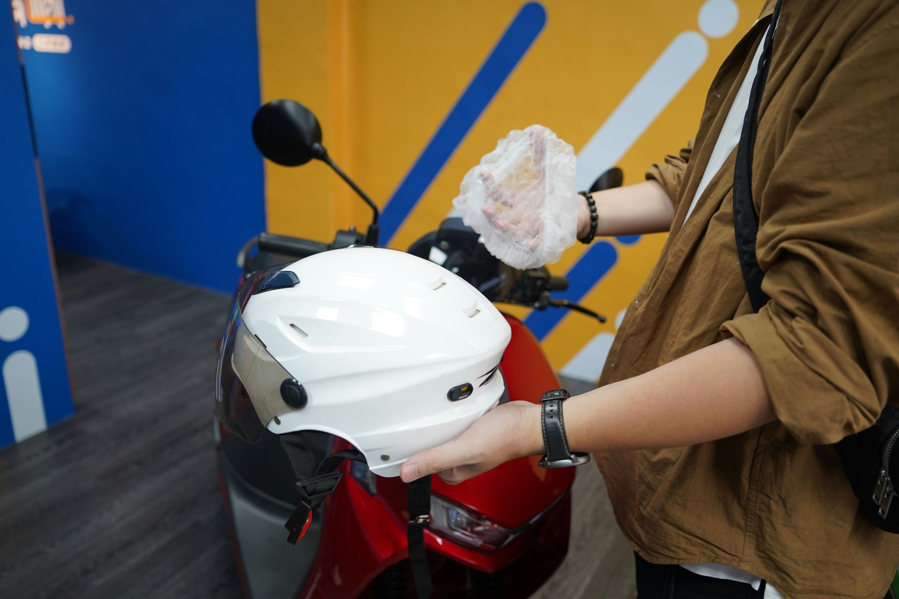 店家在道路試車這塊也有顧及到顧客衛生,在使用店家的安全帽前會先消毒並且附上帽套,對體驗顧客的衛生上也做到把關。