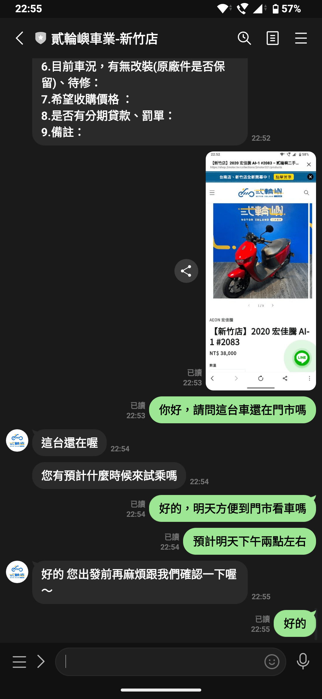 不過俗話說眼見為憑,車況還是要見到真車才算數,因此我在網站上看見台車的當下是晚上快11點,加了店家的LINE@ 官方帳號做詢問,這台車是否還在,能否預約時段到現場賞車。