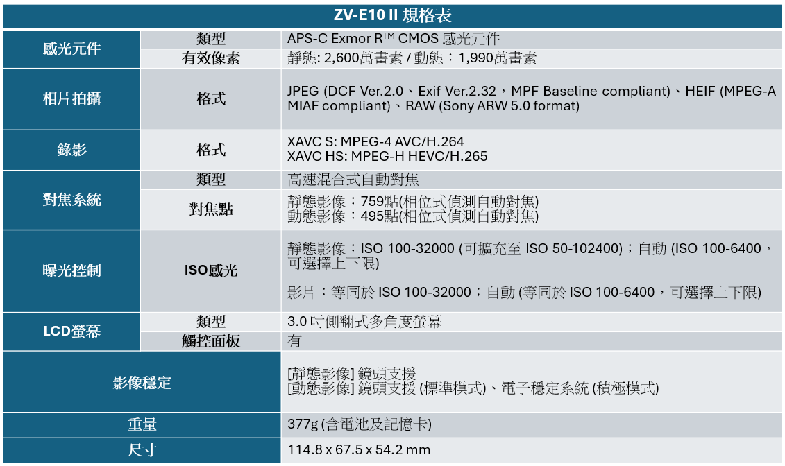 Sony ZV-E10 II 搭配最大可達2,600萬像素的 Exmor R™ CMOS感光元件,採用 Sony 最新 BIONZ XR™影像處理器以提高畫質表現,並改善自動變焦功能、於動態影像拍攝加入可拍出具電影風格影片的影視部落格設定 、全新直式操作介面。