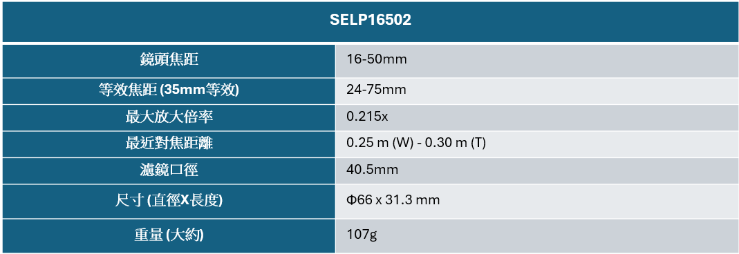 SELP16502 為 Sony 第 75 支 E 接環鏡頭,與第一代鏡頭相比,升級後的SELP16502重量僅有107克的輕巧,其錄影表現與變焦時的自動追蹤對焦能力也更為優化,透過採用 4片非球面鏡片和 1片ED (超低色散)鏡片實現高解析畫質;最近對焦距離0.25m(W)/0.30m(T),最大放大倍率為0.215x,滿足輕便攜帶滿足日常拍攝需求。