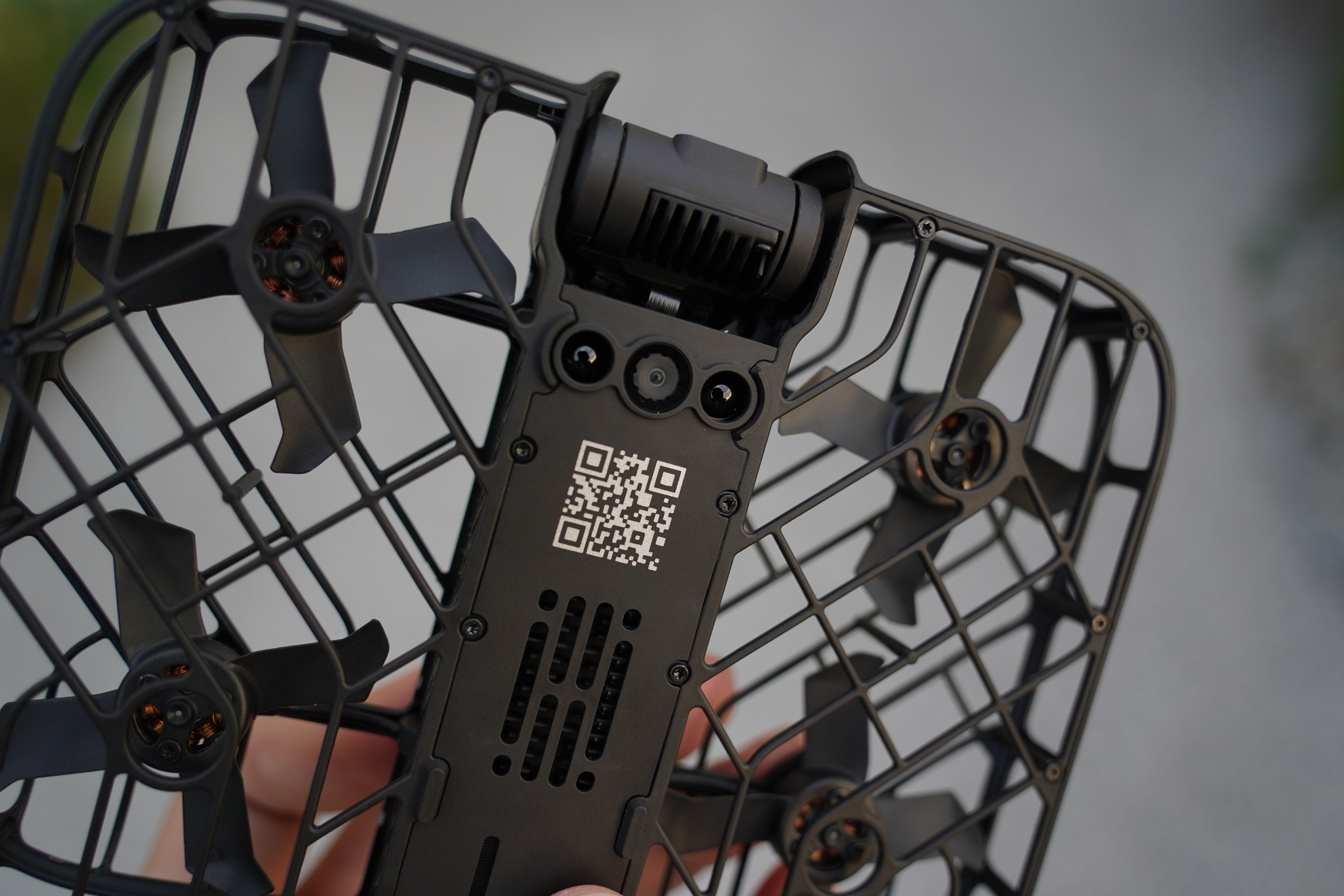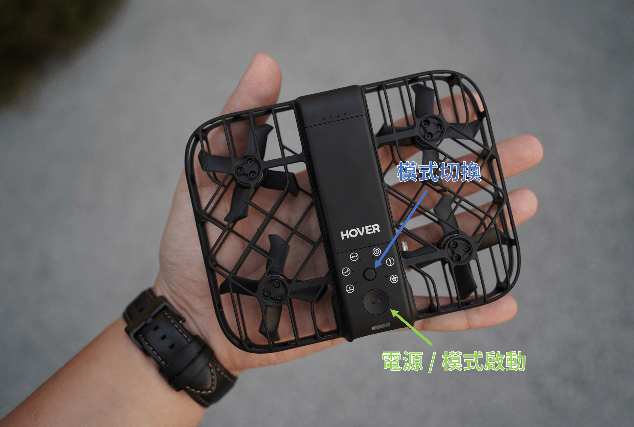 X1 Smart 的本體操作在機身上方兩個實體按鍵,當設備開機後聽見指示音就能進行操作,由上方的按鍵切換六種模式,再把 X1 Smart 拿到與操作者的臉平視高度,給予辨識鎖定拍攝對象,接著短按電源鍵即可啟動飛行。