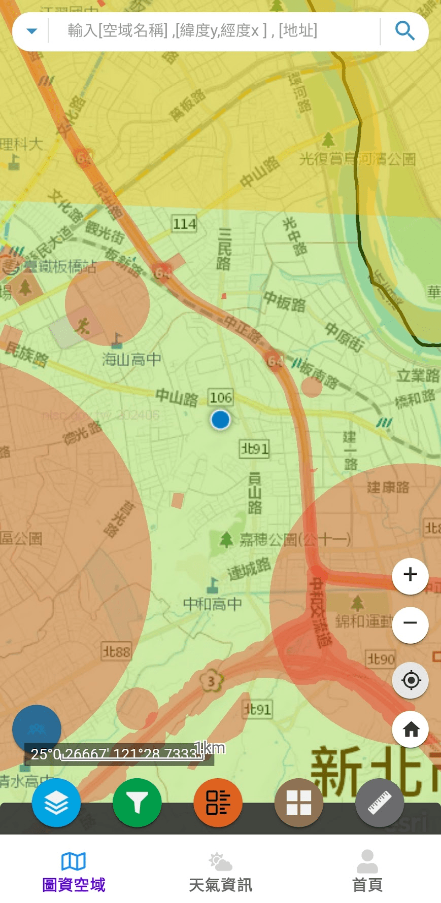 在台灣使用空拍機之前,你不能不下載的手機APP程式「Drone Map – 無人機行動服務」,【Android載點】、【iOS載點】,透過這款APP你可以透過定位了解你目前是否在航空飛行管制區,透過地圖上的顏色來進行區分,綠色為合法可飛行區,黃色代表有條件操作,紅色為禁飛區,遵循法規安心體驗。