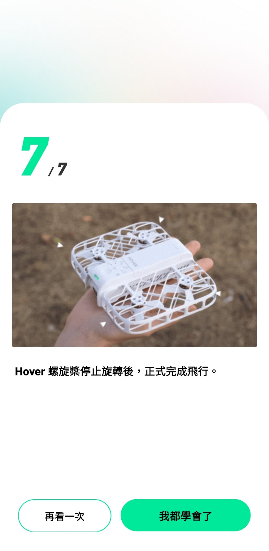 第一次配對完成後,初學者可以透過APP裡面的新手教學模式來完成初次飛行。